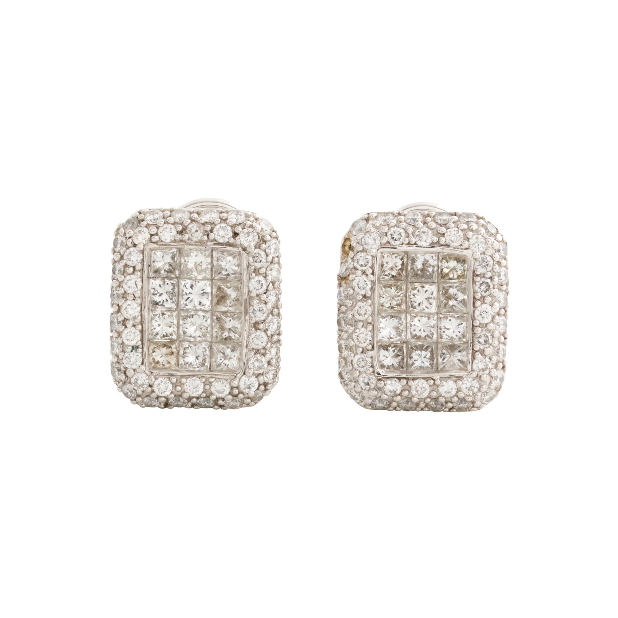 Each earring comprising a central panel of illusion-set princess-cut diamonds, within a pavé-set diamond border, the diamonds together weighing approximately 1.82 carats, to post and clip fittings, length 15mm, width 13mm, gross weight approximately 8.9 grams.