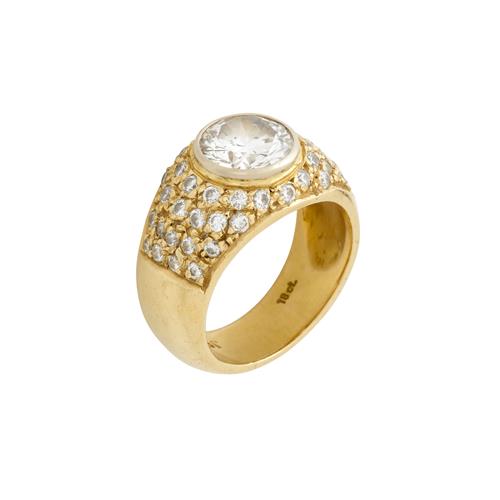 Centring a bezel-set brilliant-cut diamond weighing approximately 1.70 carats, to pavé-set diamond shoulders, size I½ , gross weight approximately 10.6 grams.