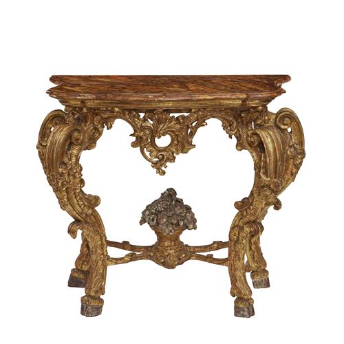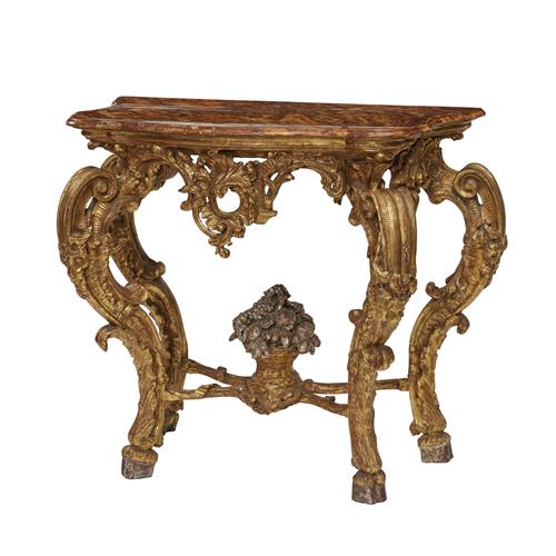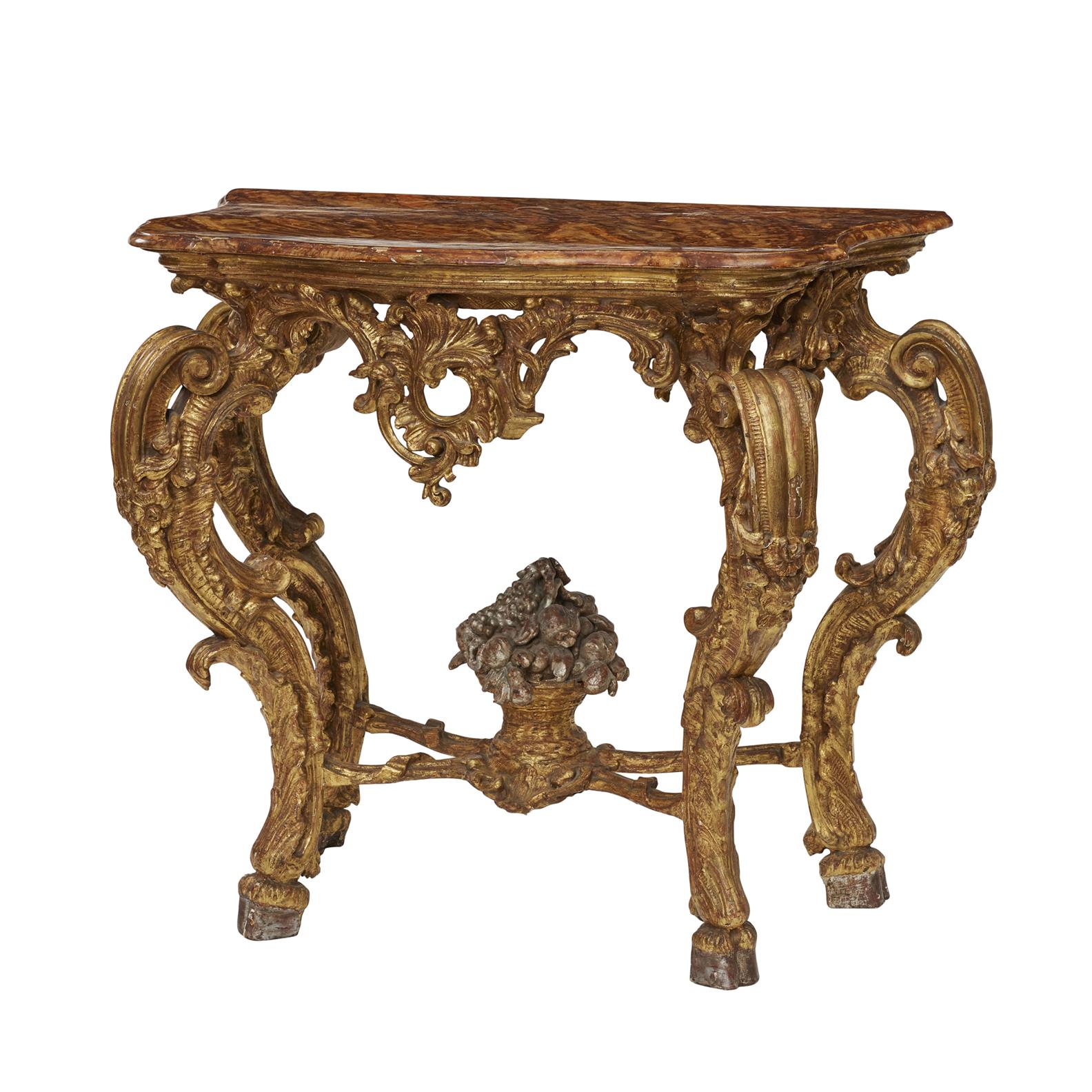 18th century, the shaped faux marble top above rocaille apron, and four flower swagged, leaf, scroll and volute carved legs united by ribbon carved stretchers centred by a silver leaf basket of fruit and flowers.