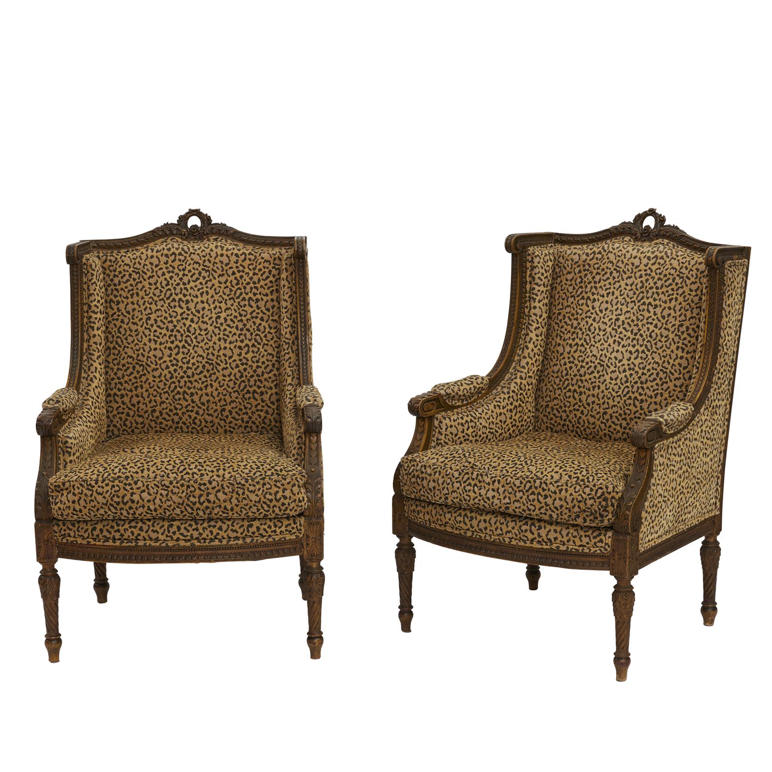 Each with a ribbon carved frame and floral wreath cresting, the padded arms with leaf carved detail flanking the padded back and seat, on leaf carved spirally fluted legs, upholstered in leopard spot tapestry fabric.