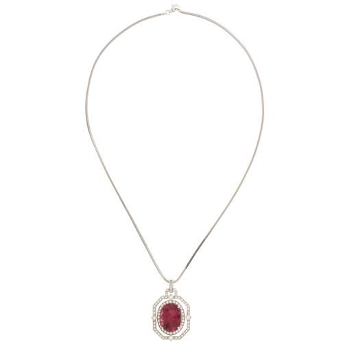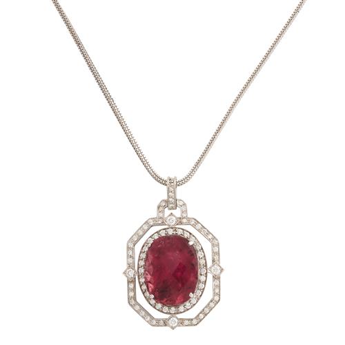Centring a claw-set pink oval checkerboard-cut tourmaline weighing approximately 27.47 carats, within an open geometric border set throughout with round brilliant-cut diamonds together weighing approximately 1.57 carats, suspended from a double box link chain, pendant length 50mm, pendant width 45mm, chain length 550mm, total weight approximately 28.8 grams.