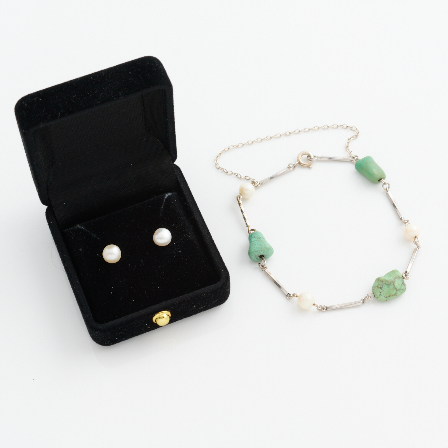 A TURQUOISE AND PEARL BRACELET, INNER DIAMETER 60MM, TOGETHER WITH A PAIR OF PEARL EARRINGS TO POST AND PLASTIC FITTINGS, THE PEARLS MEASURING APPROXIMATELY 6MM