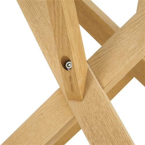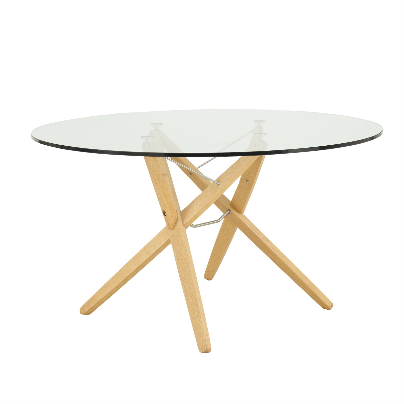 Round glass top on oak and aluminium frame.