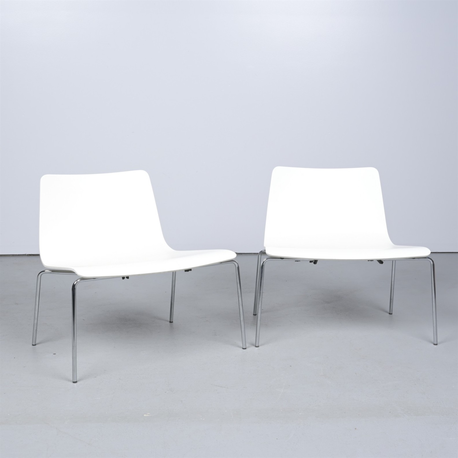 A PAIR OF GENEROUSLY-PROPORTIONED CHAIRS IN THE STYLE OF ARPER (A/F) (69CM H X 68CM W X 64CM D)