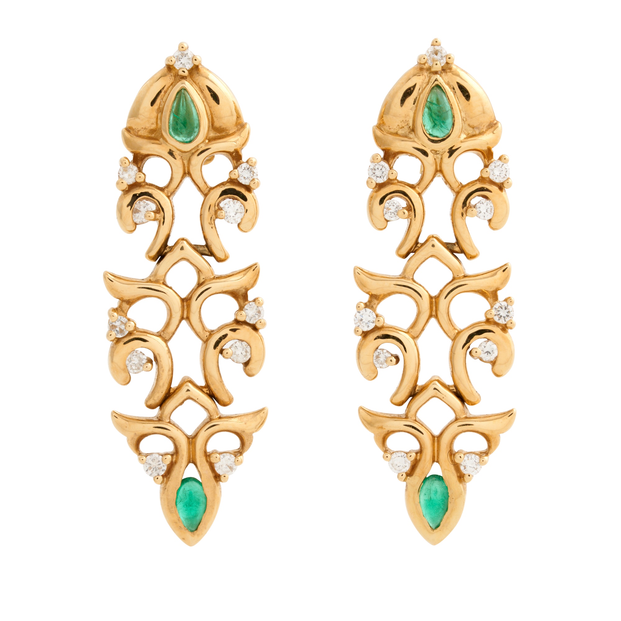 Each earring of articulated drop design, featuring two pear-cut emeralds cut en cabochon within a fancy surround detailed with claw-set round brilliant-cut diamonds, the emeralds together weighing approximately 0.60 carats, the diamonds together weighing approximately 0.88 carats, to post and butterfly fittings, gross weight approximately 16.0 grams.