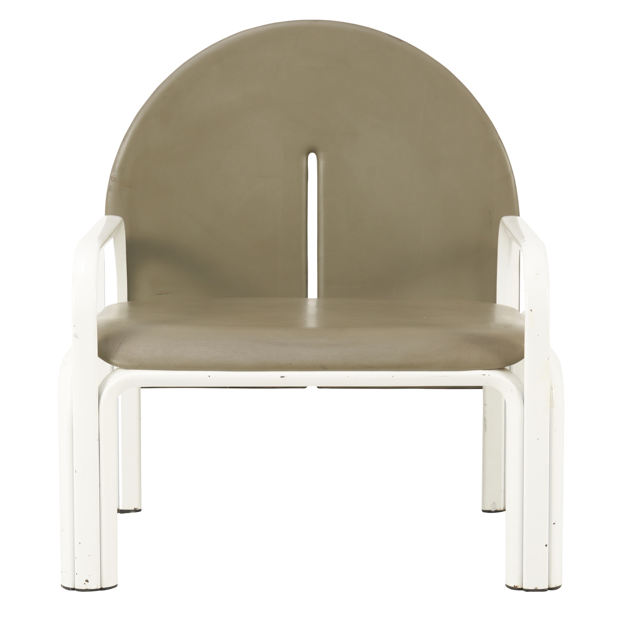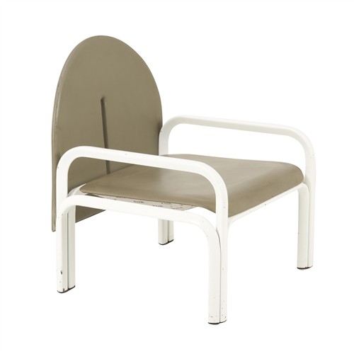 White lacquered metal frame with sage grey leather seats.