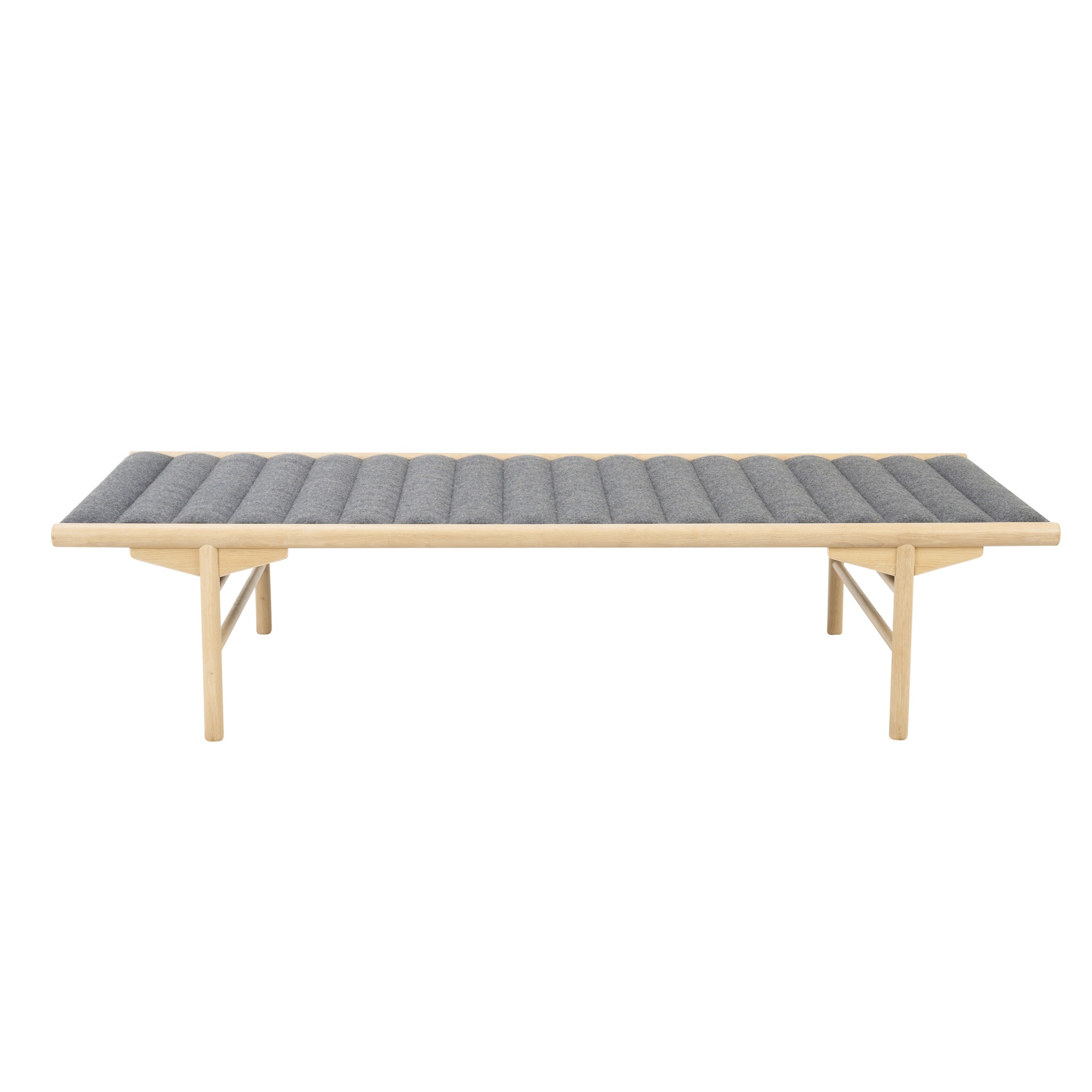 Minimalist design with quilted charcoal felt upholstery on natural oak frame.