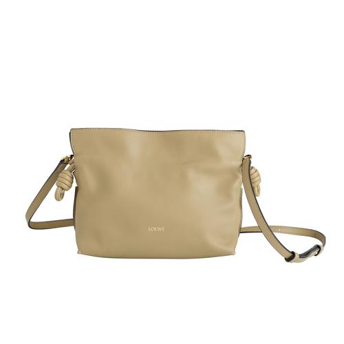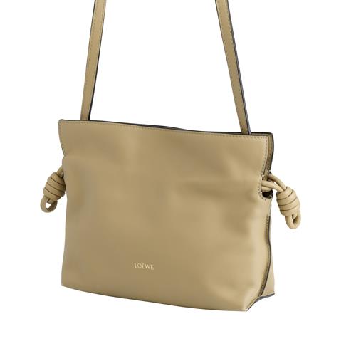 Styled in sand coloured leather, featuring gold tone hardware and detachable crossbody strap, designed with knot detailing at the drawstrings and magnetic snap closure, measures 22 x 18 x 6 cm.
