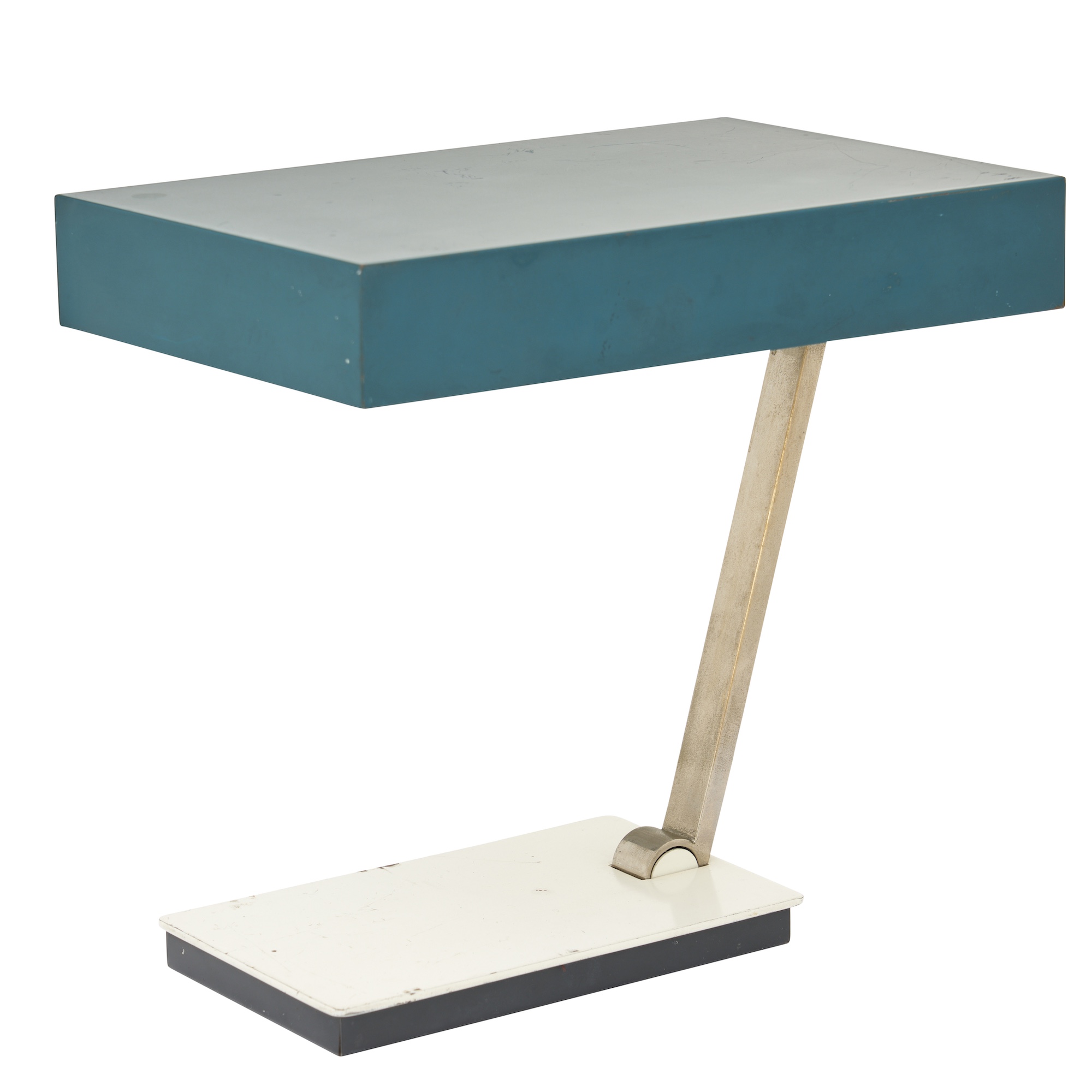 The cast metal lamp base has a lacquered white finish, light wear and scuffs to base consistent with age. The teal shade has scuffs and marks consistent with age. Light patina to brass stem.