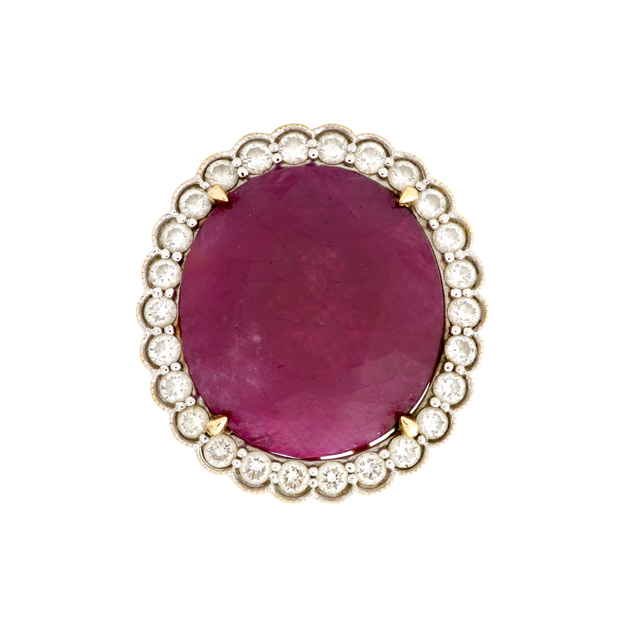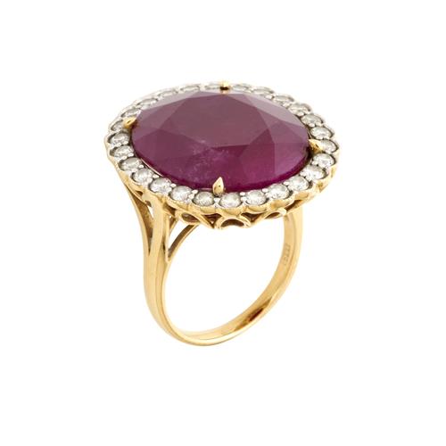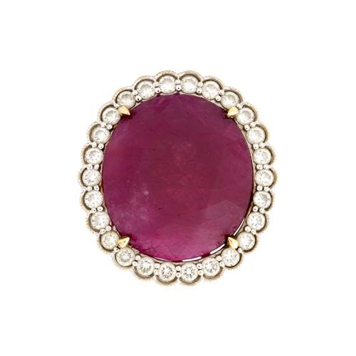 Of cluster design, centring an oval-cut ruby weighing approximately 25.91 carats, within a surround of rubover-set round brilliant-cut diamonds together weighing approximately 1.17 carats, size N ½, gross weight approximately 12.6 grams.