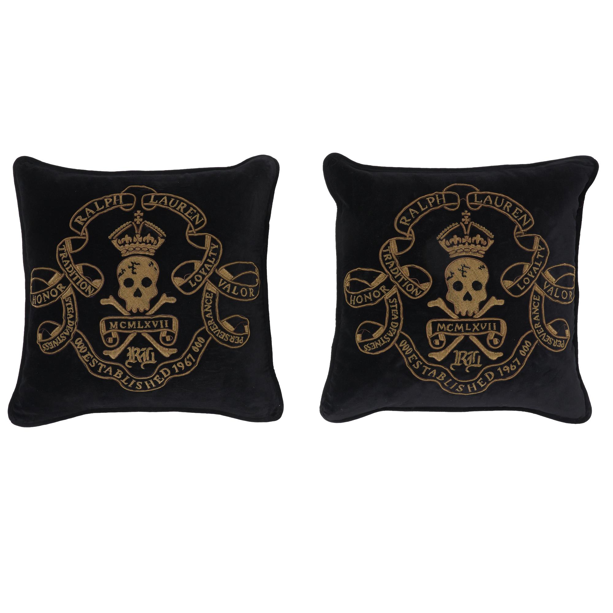 Each styled in black velour with large bronze french wire embroidered 'Jolly Roger' emblem, measuring 50 x 50 cm.
