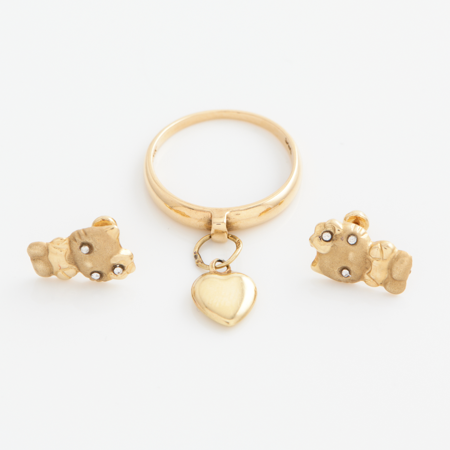 A HEART CHARM RING IN 14CT GOLD, SIZE O, TOGETHER WITH A PAIR OF GEM SET EARRINGS IN 14CT GOLD TO POST AND BUTTON FITTINGS, 13MM X 7MM, TOTAL WEIGHT 2.7GMS