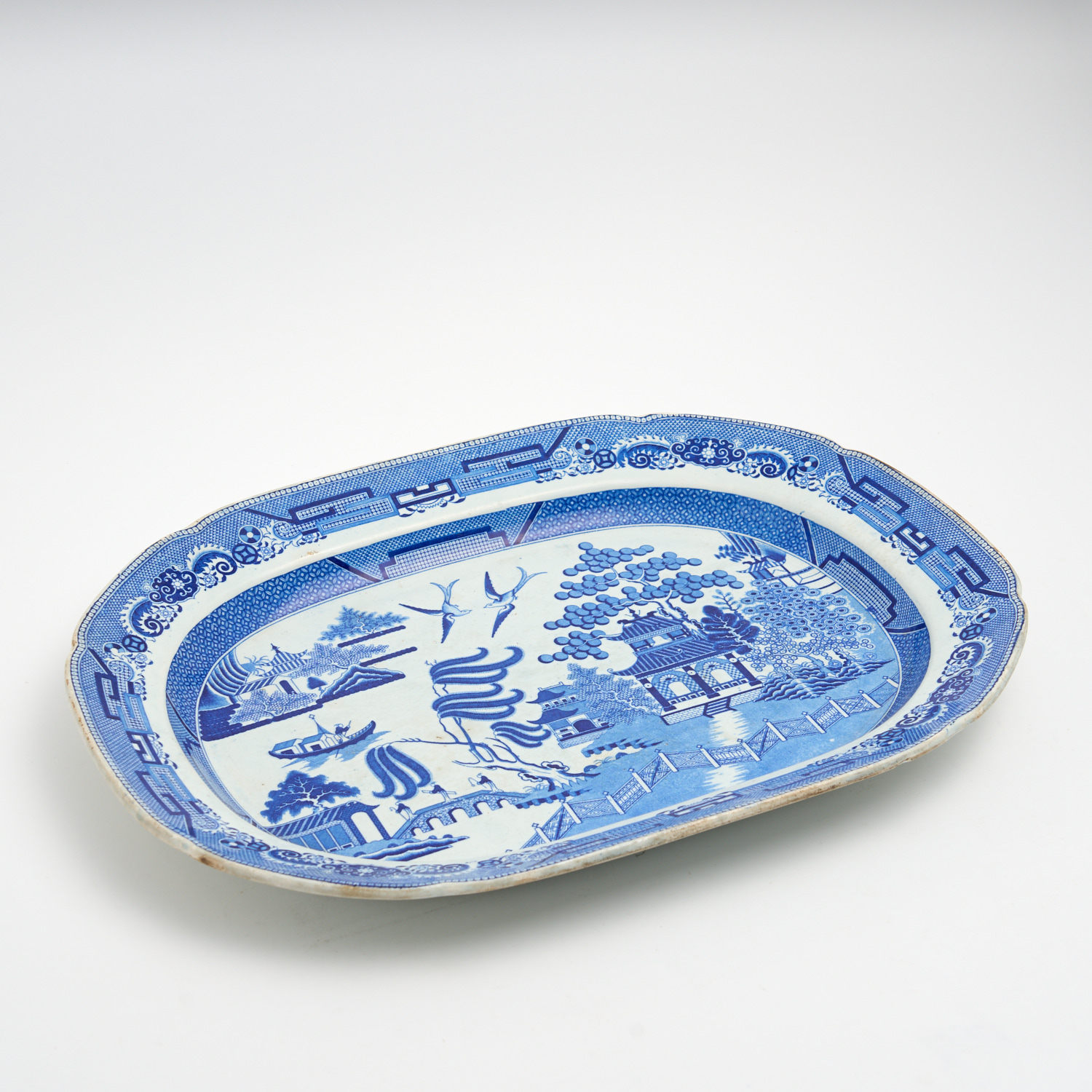 A MID 19TH CENTURY ENGLISH BLUE AND WHITE WILLOW PATTERN MEAT PLATTER L.48CM