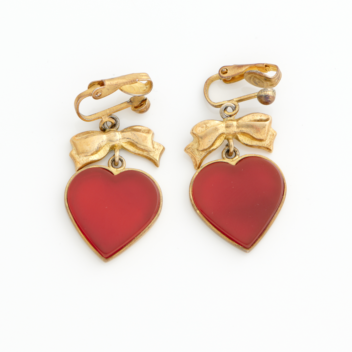 A PAIR OF CARNELIAN HEART MOTIF EARRINGS IN GOLD PLATE, 40MM, TO CLIP FITTINGS