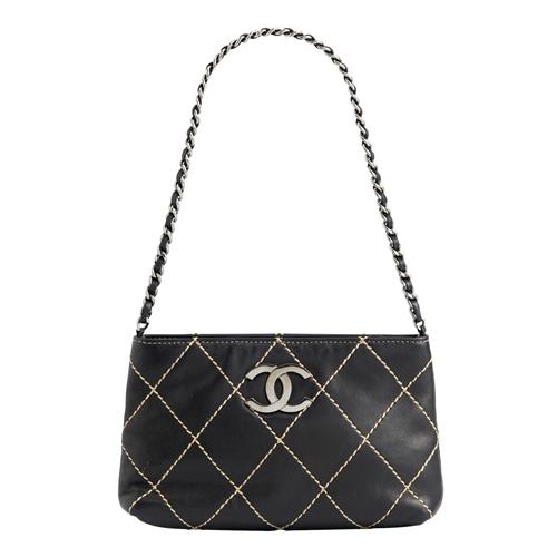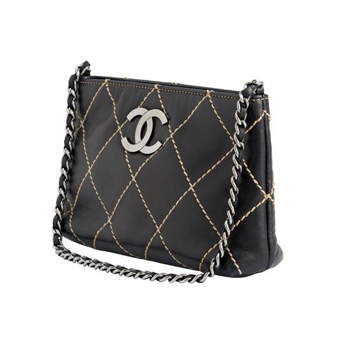 Styled in black leather with oversized contrast stitching, featuring gun metal tone hardware with 'CC' logo and leather woven chain strap, measures 20 x 12 x 4cm.