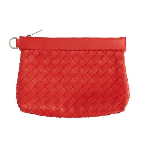 Styled in red Intrecciato leather with coordinating leather trim and silver tone hardware, measures 26 x 18 x 5 cm.