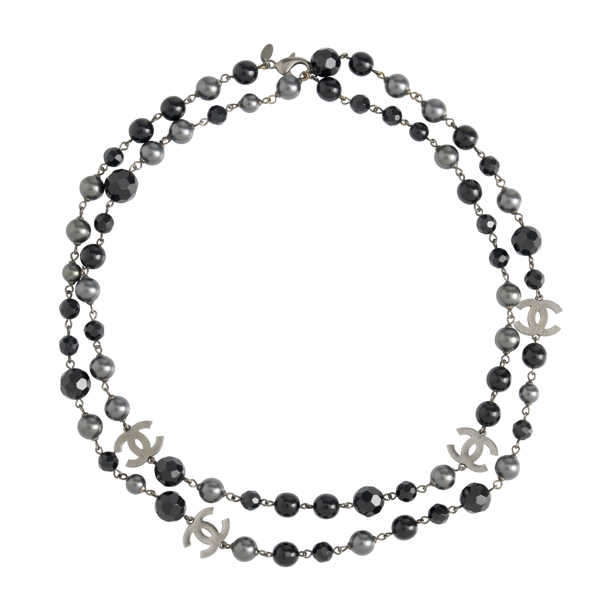 Comprising black glass gem and plastic beads linked with faux tahitian pearls on gun metal tone chain, featuring 4 'CC' logo charms, to parrot clasp, measures 116 cm total length.