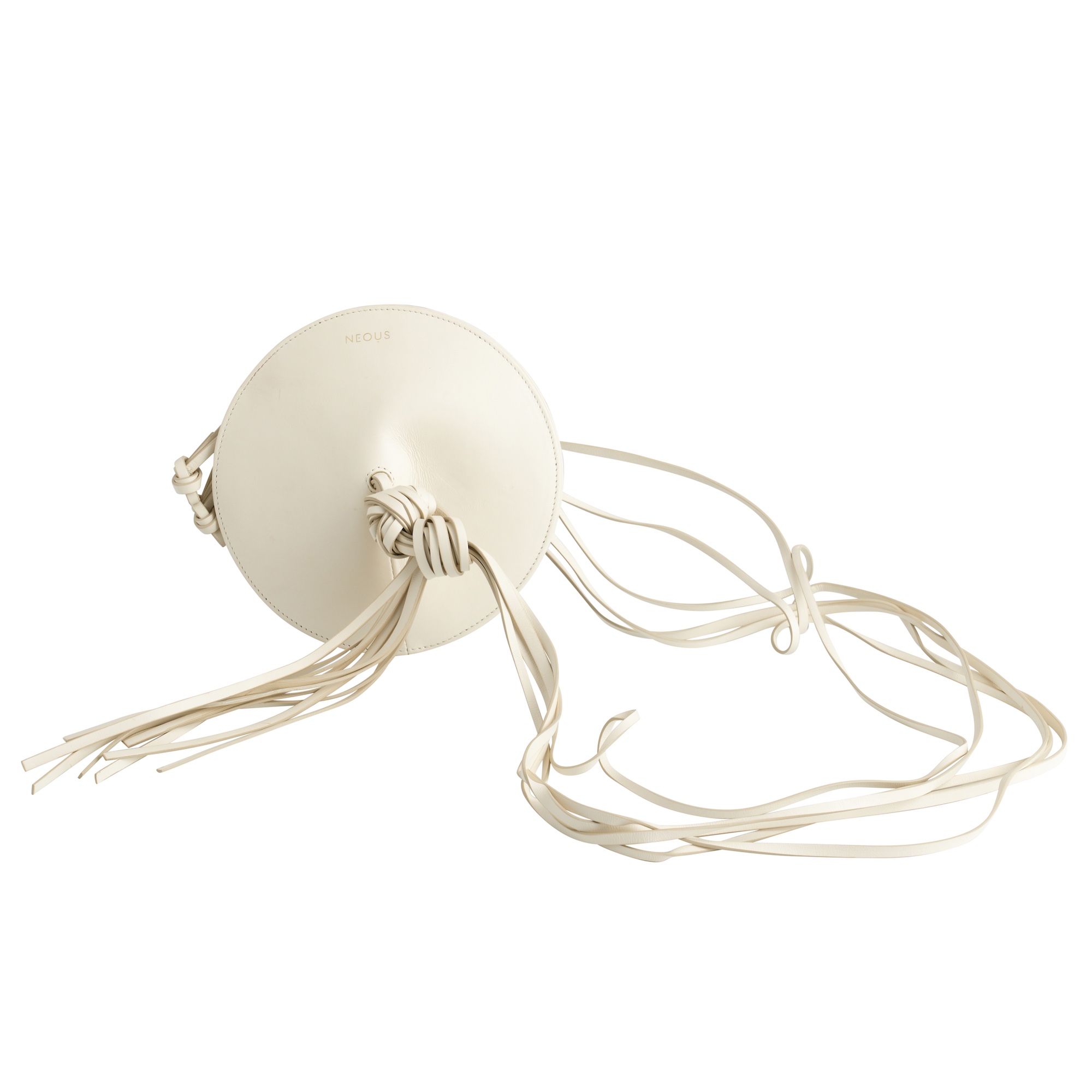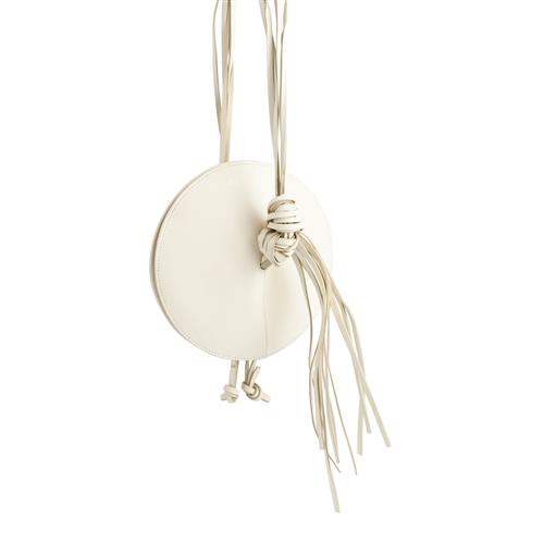 Styled in white leather in cymbal shape with tassel details, featuring suede interior, measures 21 x 21 x 8 cm.