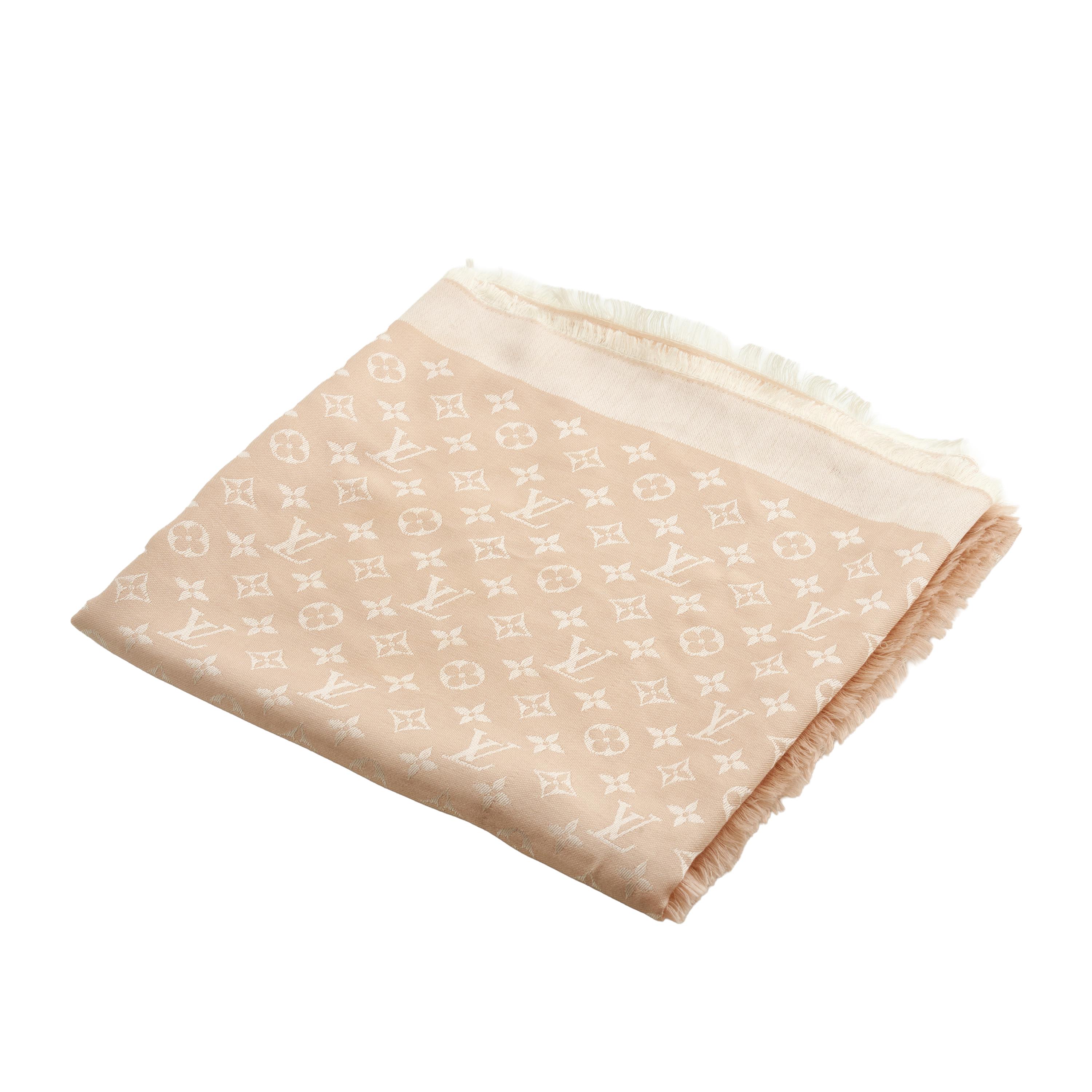 Styled in baby pink silk and wool blend with pearlescent baby pink embroidered logo and fring edging details, measures 140 cm.