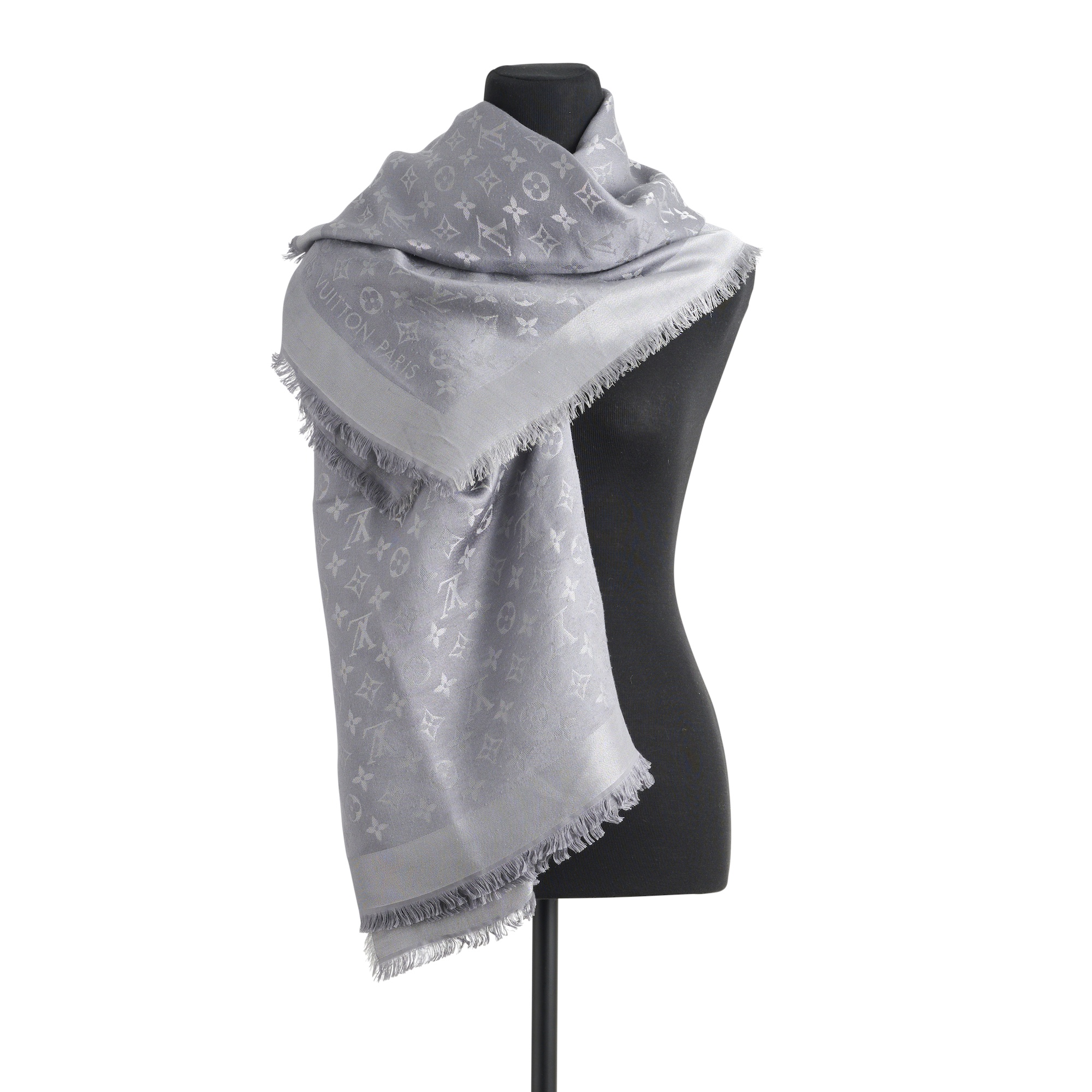 Styled in silver grey silk and wool blend with pearlescent silver grey embroidered logo and fring edging details, measures 140 cm.