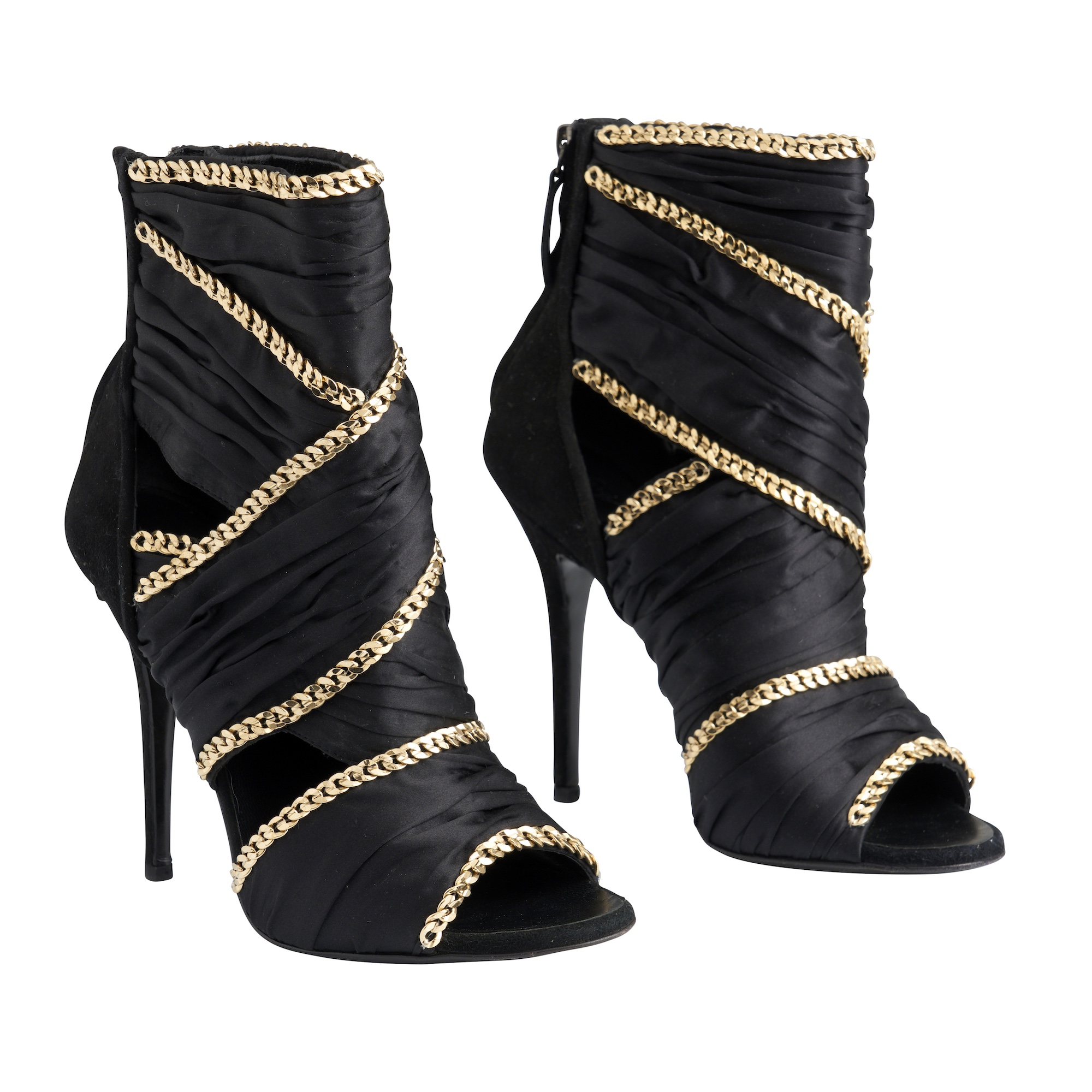 Styled in black silk on black suede with black leather soles, featuring gold tone hardware chain details, marked size 38 1/2, heel height 11.5 cm.