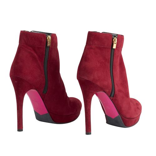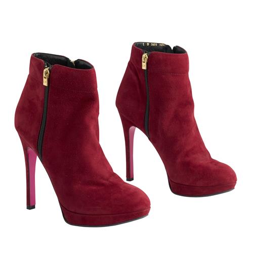 Styled in cherry red suede leather featuring exposed zip detail and gold tone zip pulls, designed with almond toe and heel measuring 10cm, marked size 40.