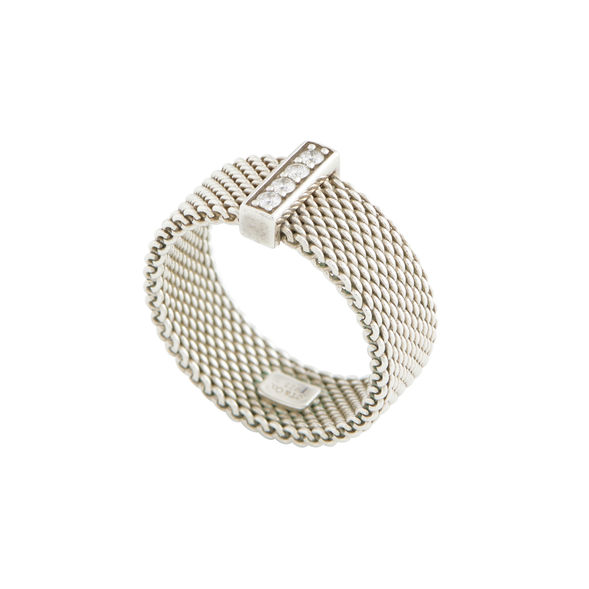 Comprising a silver mesh band with bar accent featuring a line of 4 studded diamonds, measures size K.