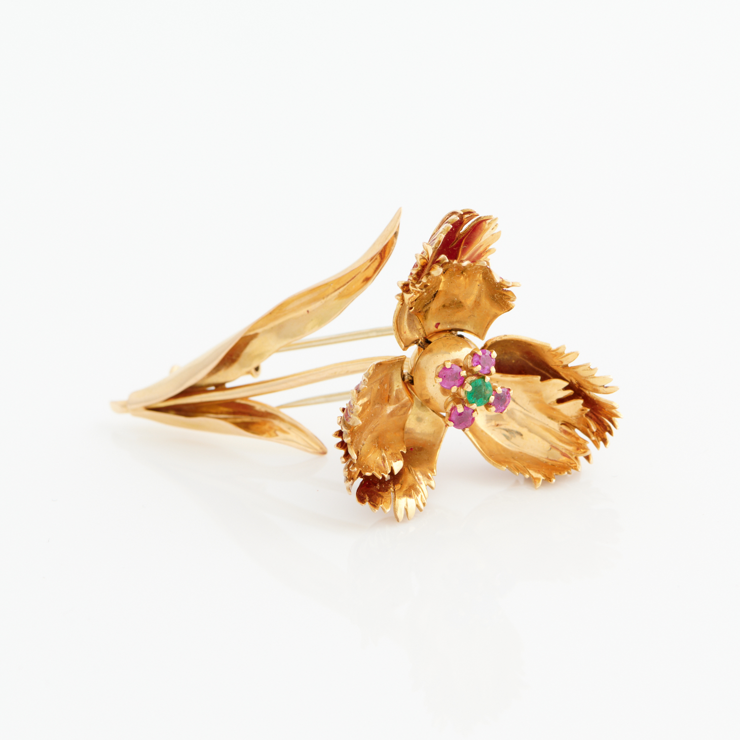 JEAN PARMENTIER, A VINTAGE FRENCH ENAMEL, RUBY AND EMERALD 'BLOSSOMING FLOWER' BROOCH IN 18CT GOLD, TO A DOUBLE PIN BACK, TELESCOPIC HINGE, 55MM X 25MM, 13.3GMS