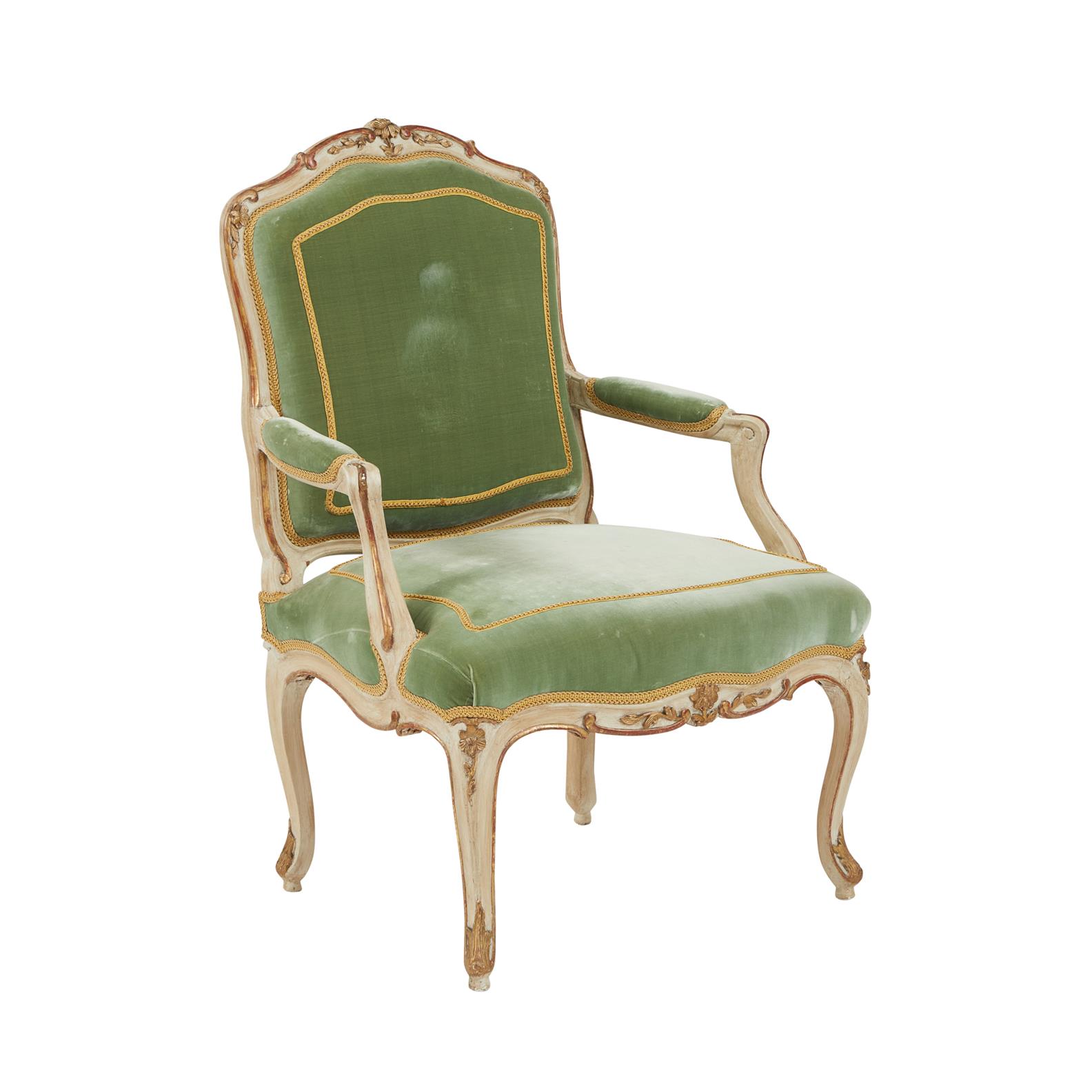 A LOUIS XV CREAM PAINTED AND PARCEL GILT FAUTEUIL A LA REINE