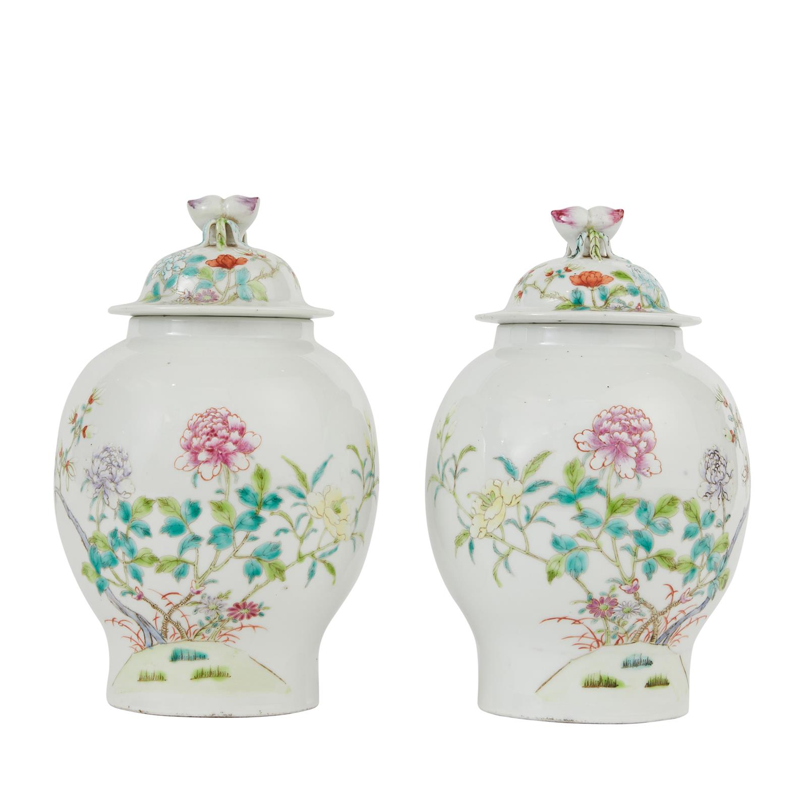 Republic Period, each decorated in the famille rose palette with flowering peony and magnolia, the domed cover with double peach finials.