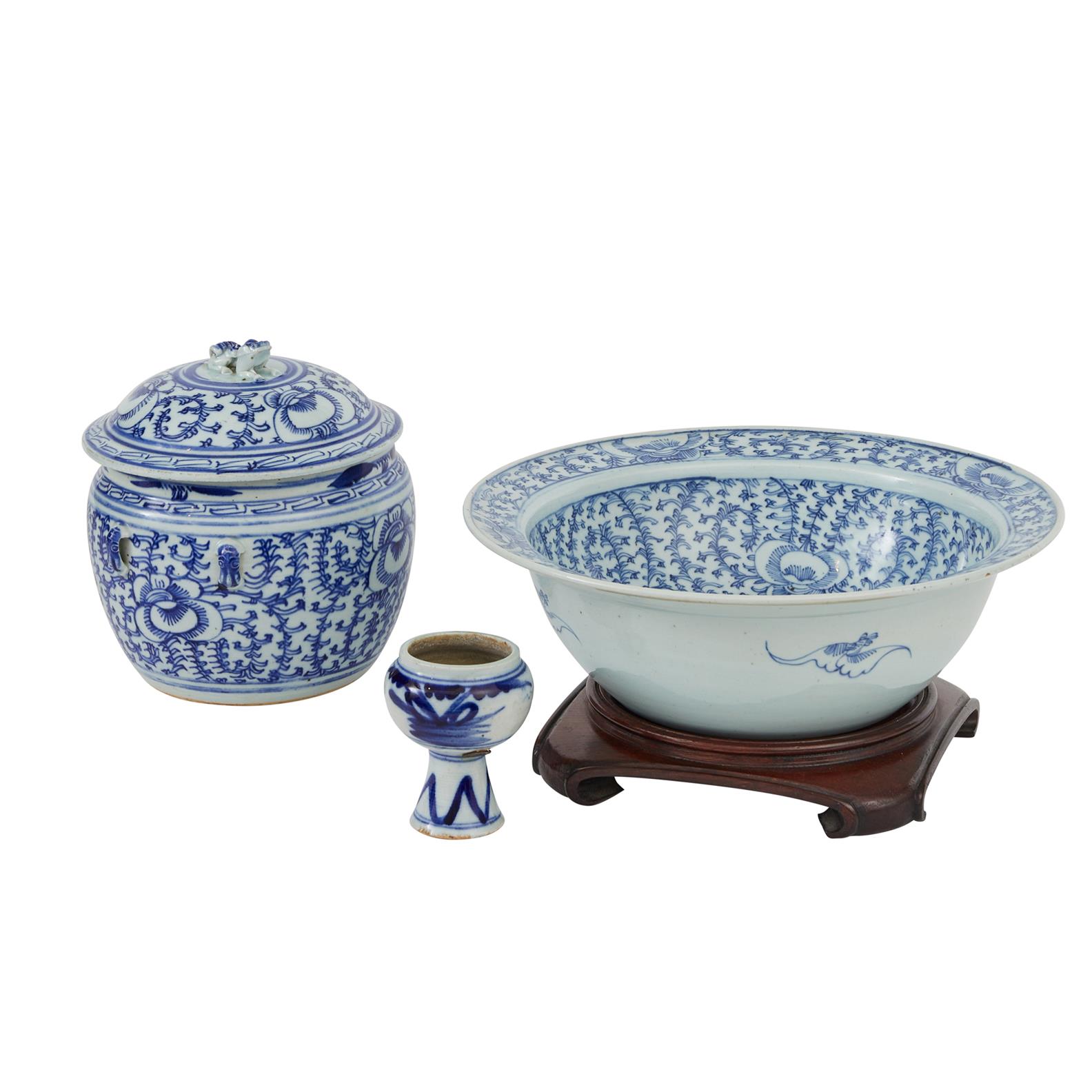 Late 19th century, comprising a jar and cover, a basin and a stem cup, each decorated all over with tendrils.