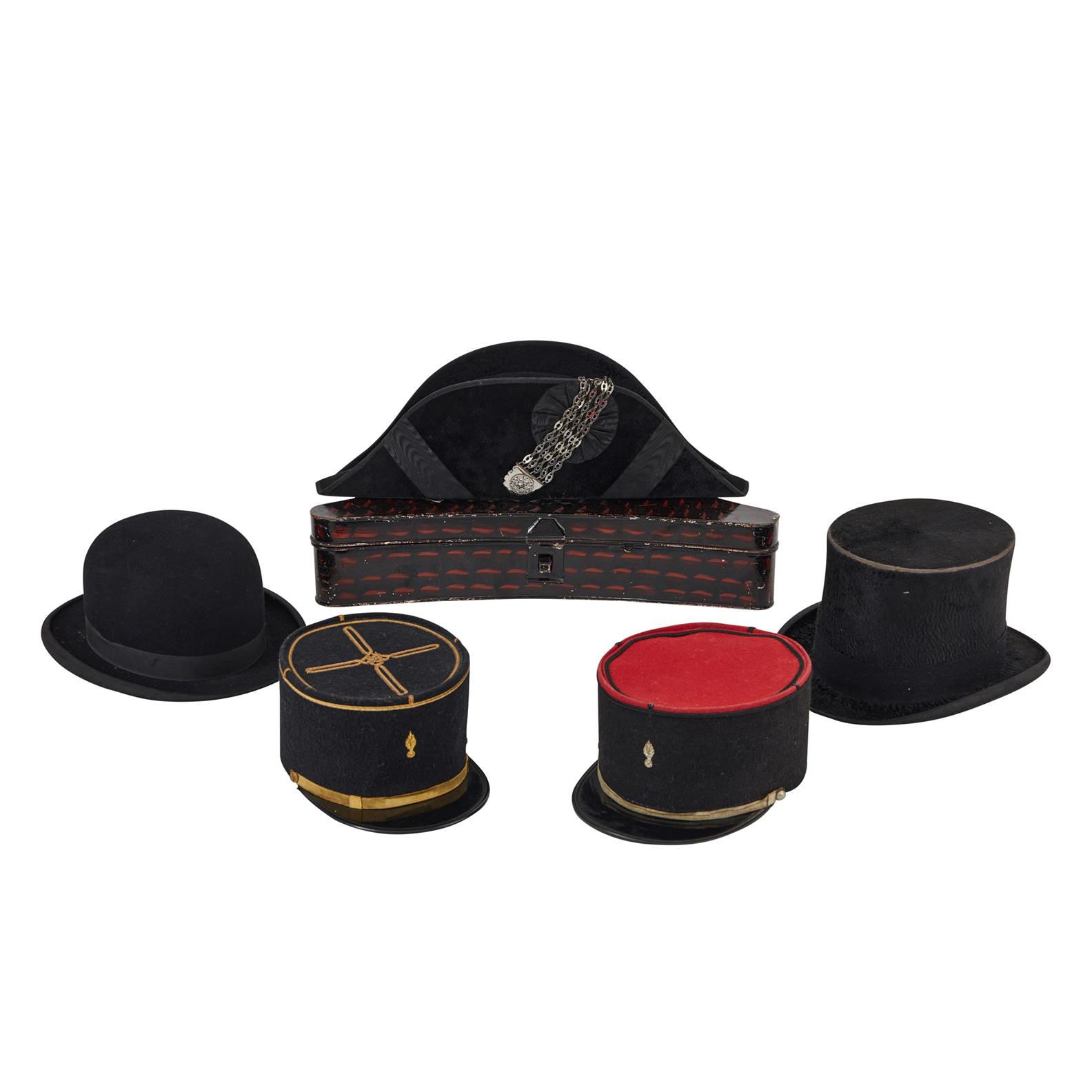 A GROUP OF HATS INCLUDING TWO KEPIS, A BOWLER, A BICORNE AND A TOP HAT