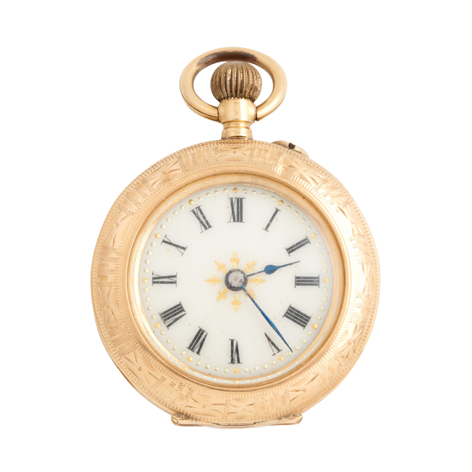 A LADY'S 14CT GOLD AND ENAMEL OPENFACE POCKETWATCH CIRCA 1900