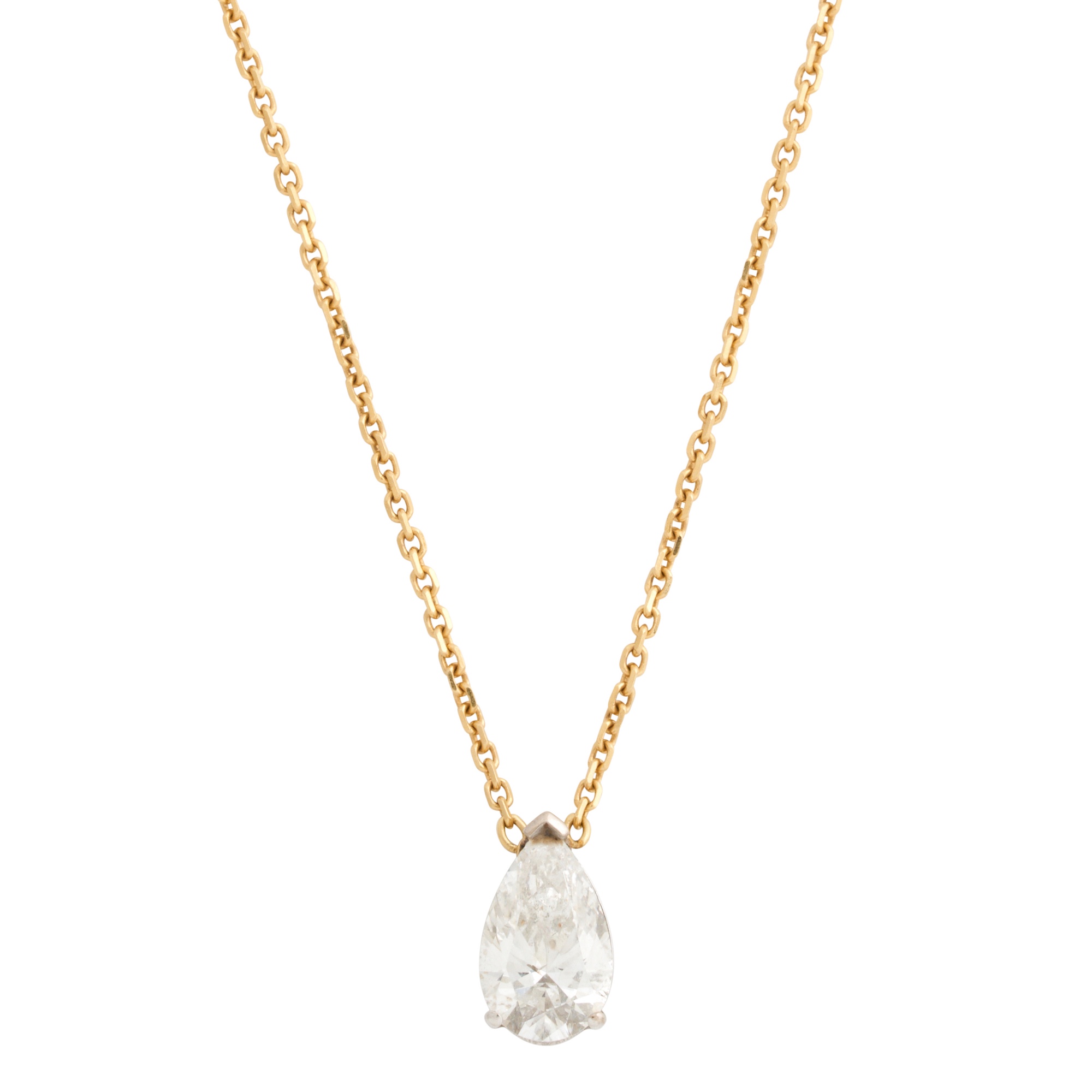 Claw-set with a pear-cut diamond weighing approximately 1.01 carats, to an integral fine trace chain completed by a parrot clasp, length 440mm, gross weight approximately 3.2 grams.