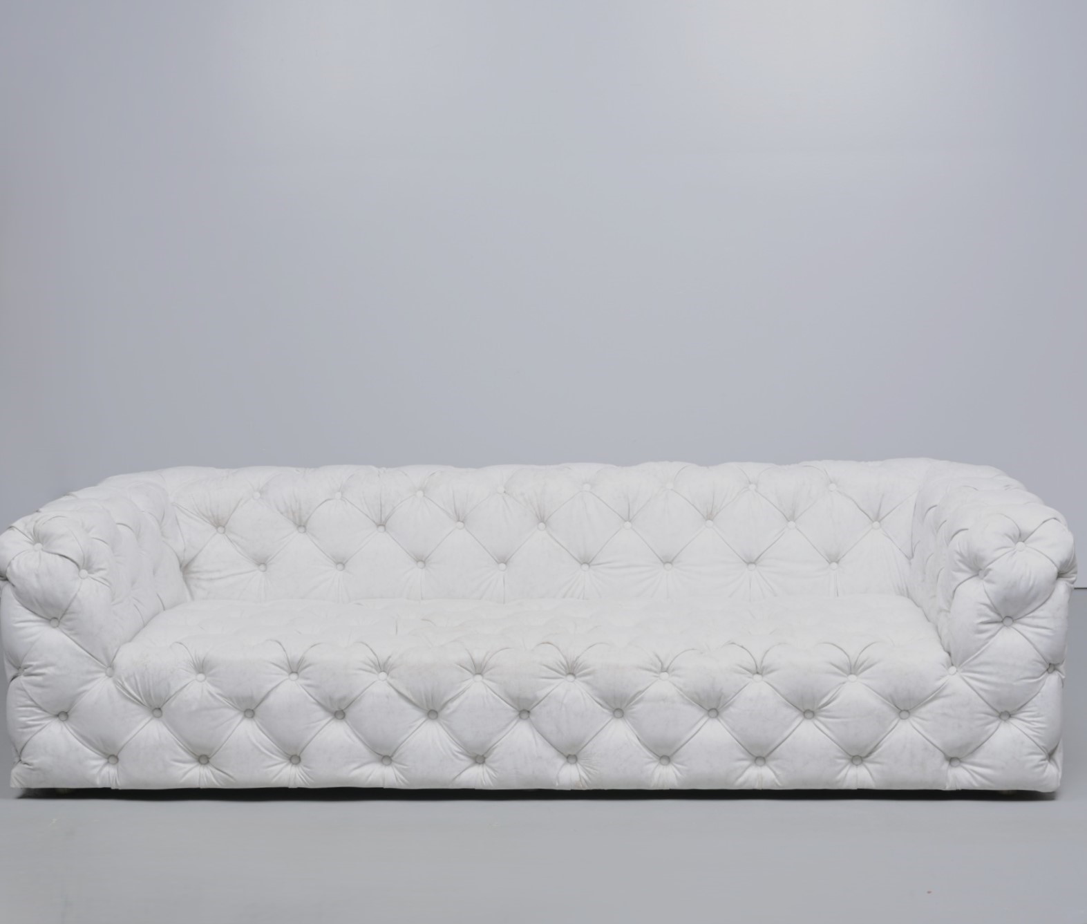 A LARGE WHITE LEATHER CHESTERFIELD THREE-SEAT SOFA BY TIMOTHY OULTON (67CM H X 247 CM W X 102CM D) (THIS ITEM MUST BE REMOVED BY PROFESSIONAL CARRIERS OR CLIENTS. LEONARD JOEL STAFF CANNOT ASSIST WITH CARRYING OR DELIVERY OF THIS ITEM)
