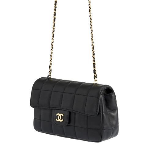 Styled in grid quilted black lambskin with gold tone hardware, featuring braided chain strap and 'CC' logo hardware embellishment, measures 18 x 9 x 5 cm.