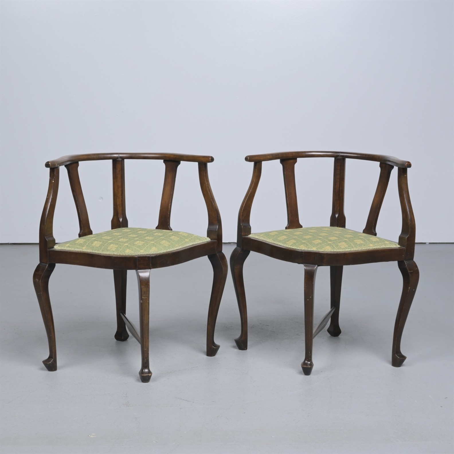 A PAIR OF MAHOGANY AND UPHOLSTERED CORNER CHAIRS IN ANTIQUE MANNER (72CM H X 57CM W X 52CM D)