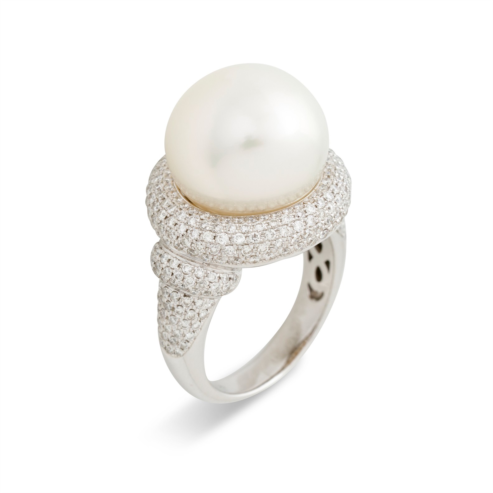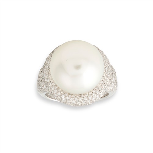 Of cluster design, centring a South Sea pearl measuring approximately 13mm, within a surround of pavé-set brilliant-cut diamonds, to similarly set shoulders, the diamonds together weighing approximately 1.30 carats, mounted in 18ct white gold, size M1/2, gross weight approximately 13.2 grams.
