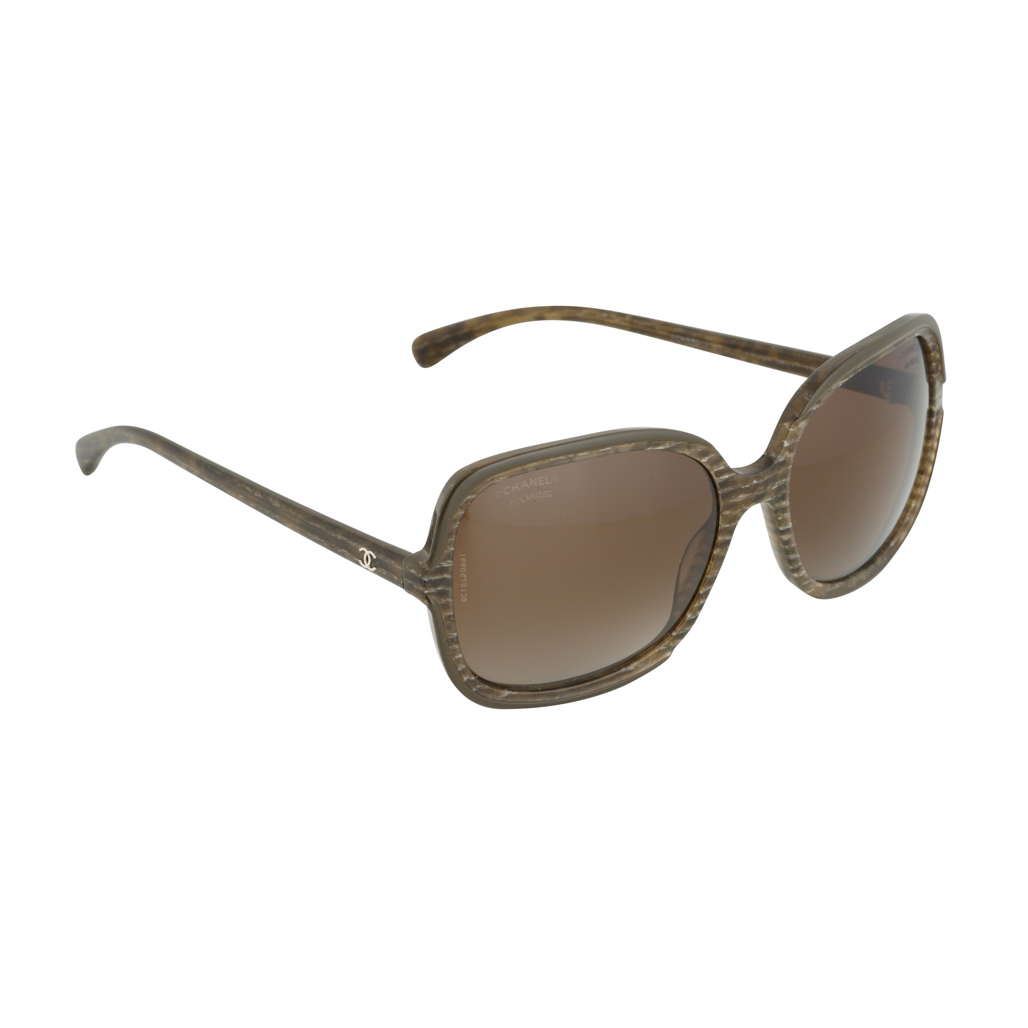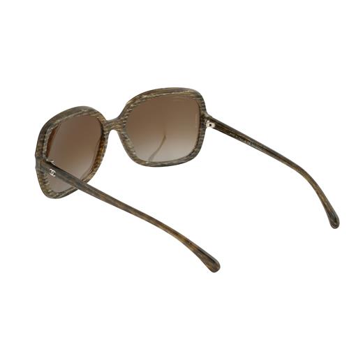 Styled in striped bronzey-taupe composite with oversized squoval frames containing brown tinted lenses, featuring silver tone hardware 'CC' detail to temple.