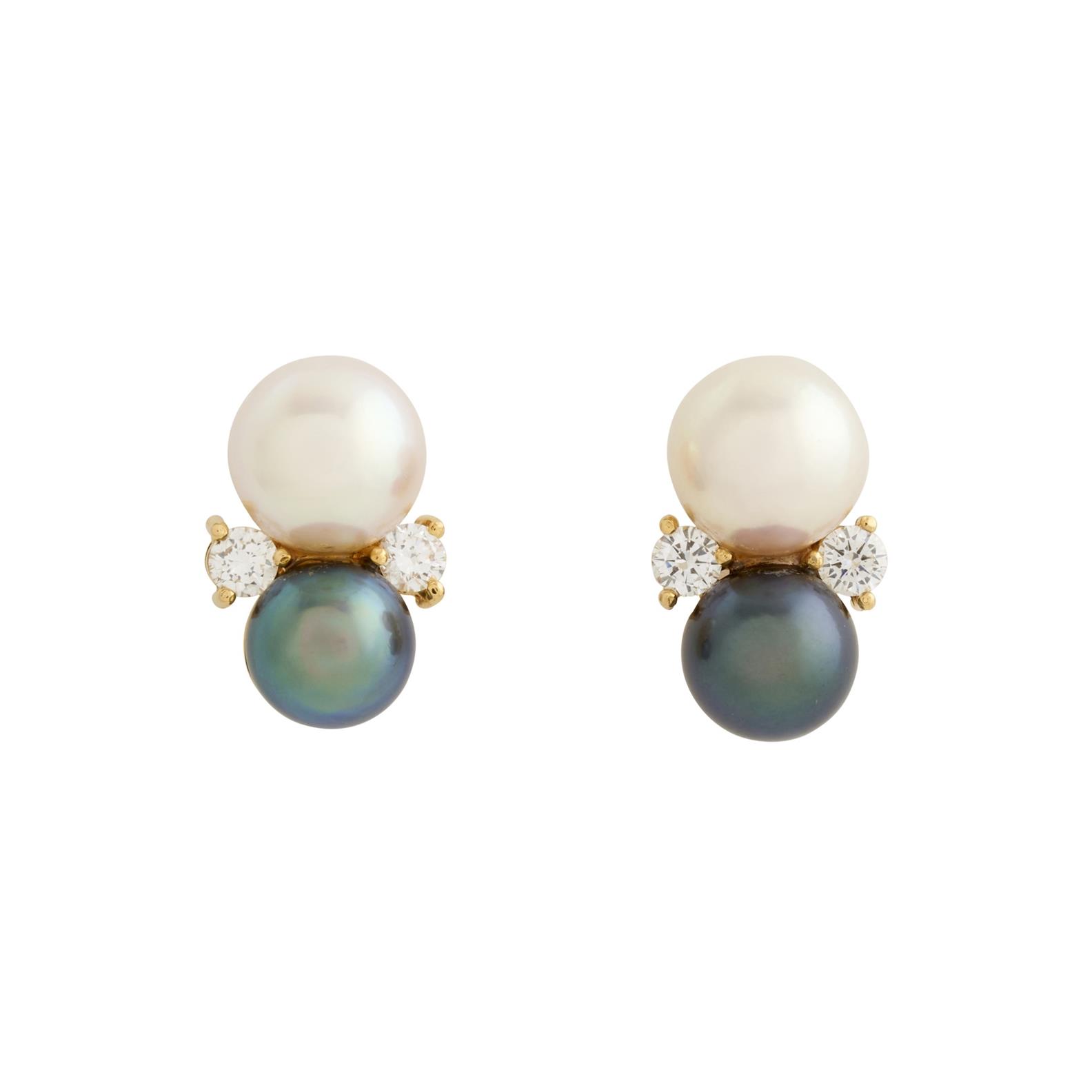 Each composed of an Akoya and a Tahitian pearl flanked by a claw-set brilliant-cut diamond, the diamonds together weighing approximately 0.30 carats, to post and fittings (scrolls deficient), length 115mm, gross weight approximately 4.9 grams.