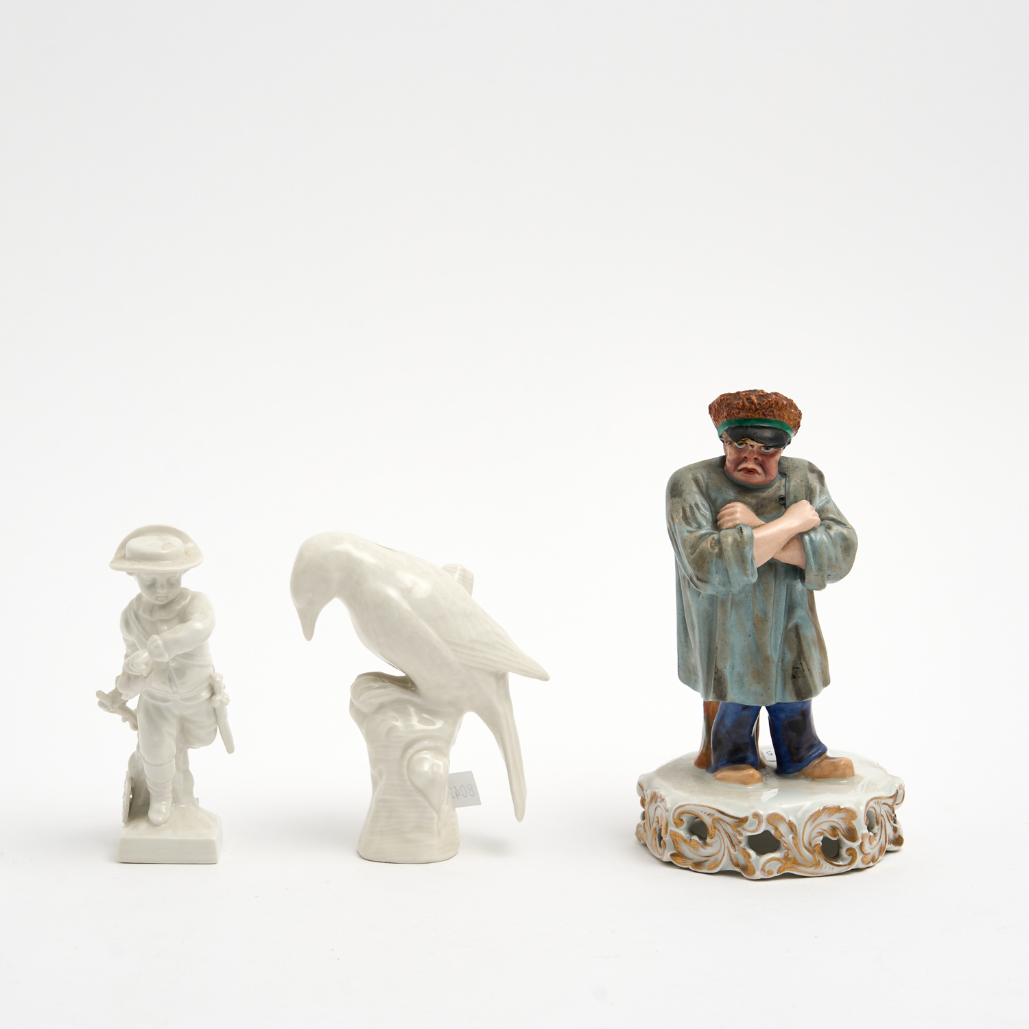 TWO KPM BLANCHE DE CHINE FIGURES TOGETHER WITH A K & G FIGURE H.20.5CM (TALLEST)