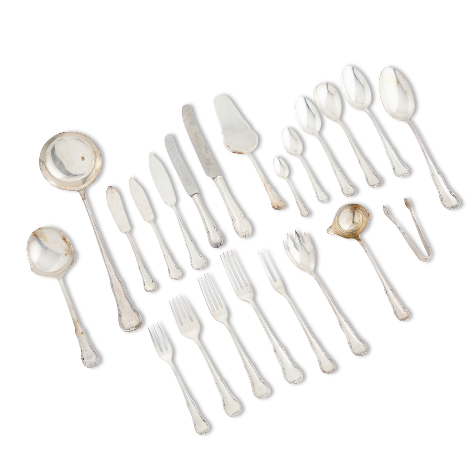 In WMF's 'Barock' pattern, a service for twelve, one hundred and forty-six pieces comprising twelve each of entrée knives and forks, fish knives and forks (and one extra knife), table knives and forks (and one extra fork), dessert forks, table spoons, dessert spoons, tea spoons, and coffee spoons, together with twelve various serving pieces including a large ladle, serving spoon, and cake slice