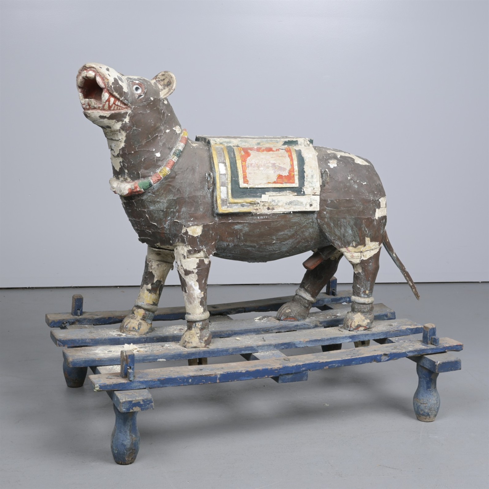 AN ANTIQUE INDIAN TEMPLE ANIMAL SCULPTURE ON STAND (124CM H X 136CM W X 100CM D) (THIS ITEM MUST BE REMOVED BY PROFESSIONAL CARRIERS OR CLIENTS. LEONARD JOEL STAFF CANNOT ASSIST WITH CARRYING OR DELIVERY OF THIS ITEM)