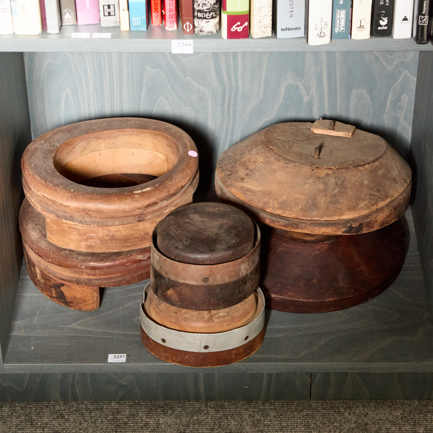 A COLLECTION OF VINTAGE HAT BLOCKS AND RIM MOULDS (TWO OF EACH EXAMPLE)