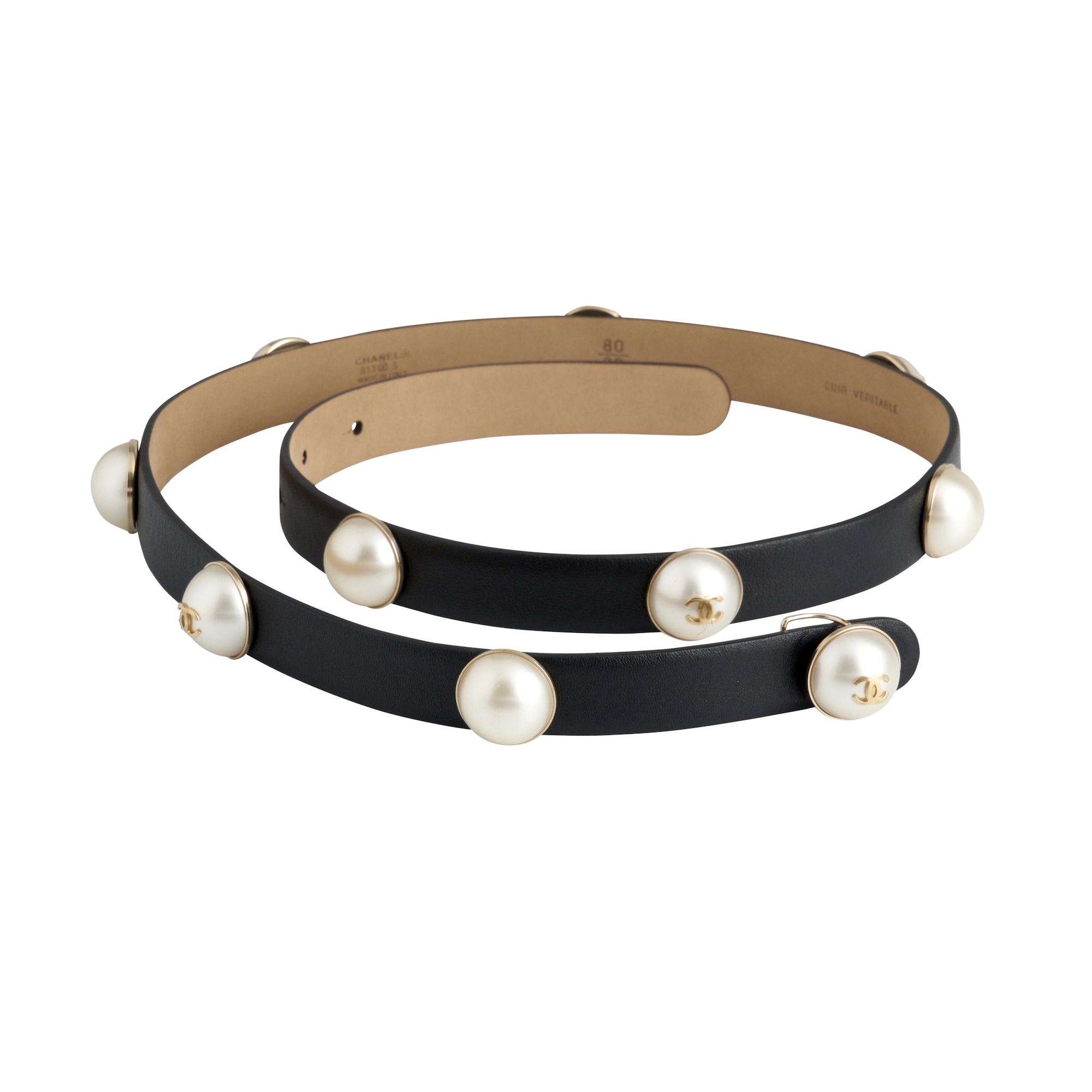 Styled in black leather featuring oversized faux pearl studs with gold tone hardware and 'CC' logo details, marked size 80/32.