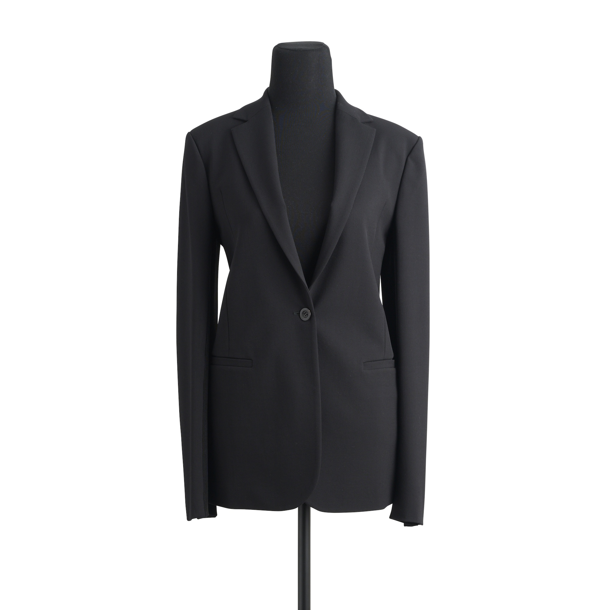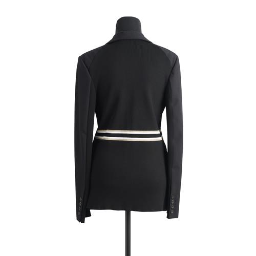 Styled in black wool blend with single button closure to the front and jersey knit fabric to the back, featuring stripe detail in white and gold lurex through centre back, marked size 44.