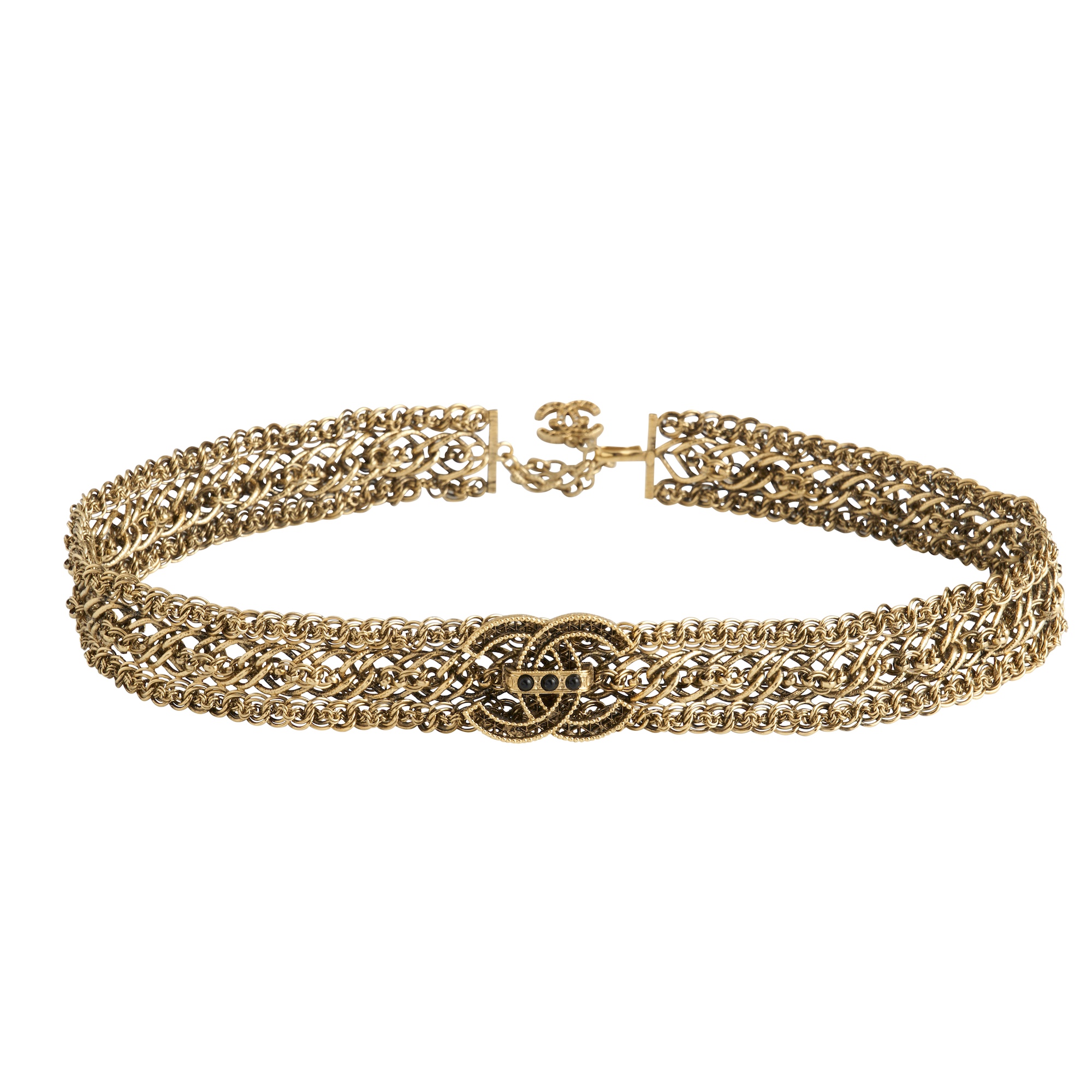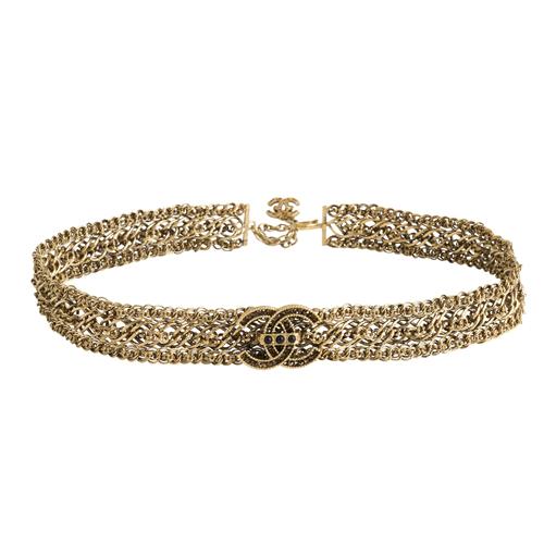 Comprising woven gold tone metal links to a hook closure, featuring hardware 'CC' logo buckle with black gem details, 72 x 3 cm.