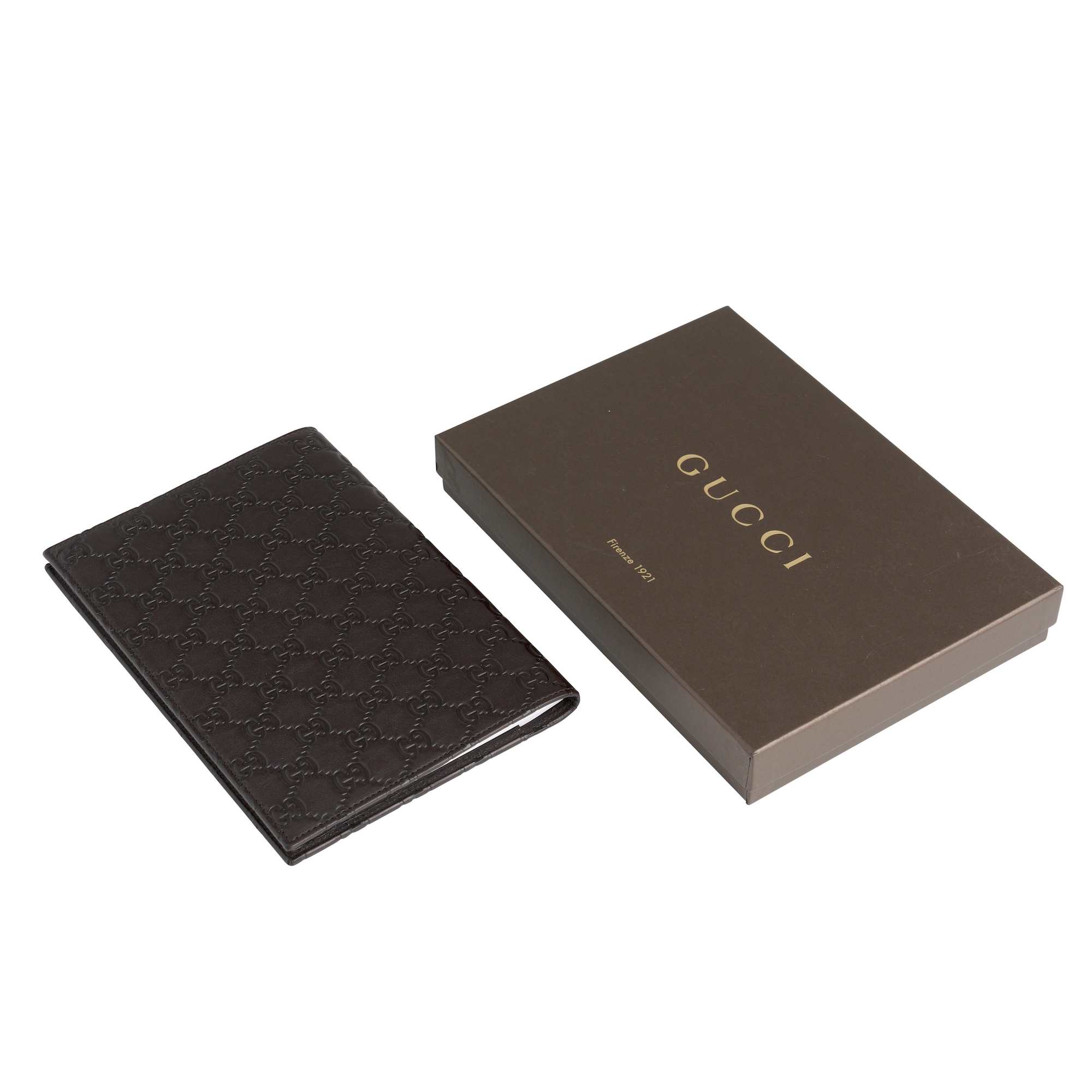 Styled in dark brown Guccissima leather, with blank notebook insert, measures 16 x 22 x 1 cm.