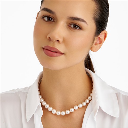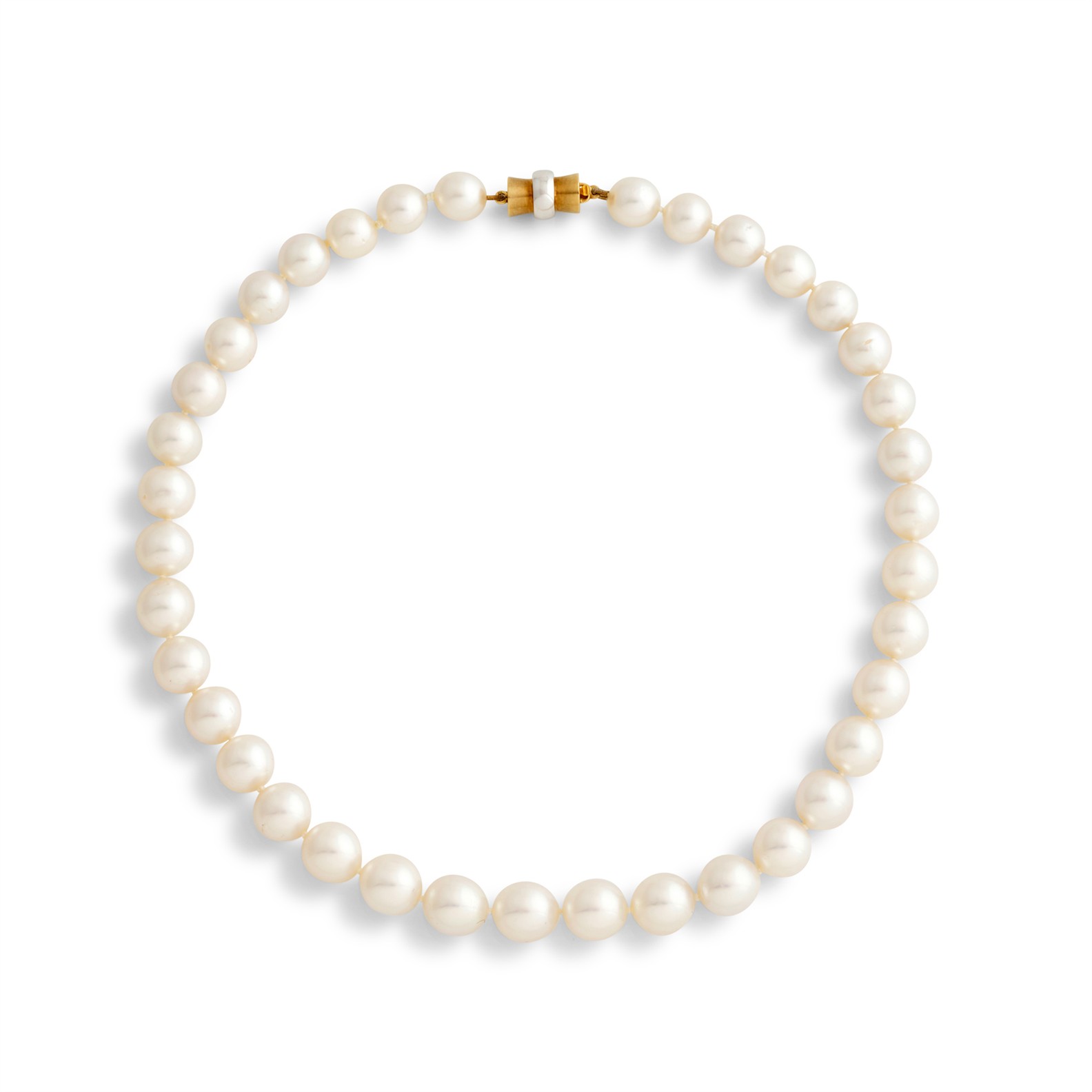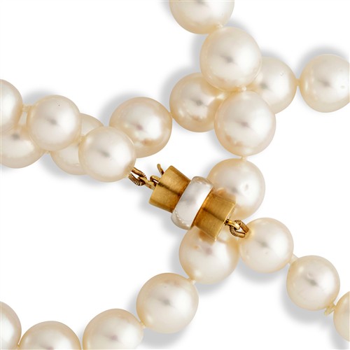Composed as a graduating line of 41 near round South Sea pearls measuring approximately 9.1mm to 10.9mm, completed by an 18ct gold clasp, length 450mm, gross weight approximately 59.6 grams.