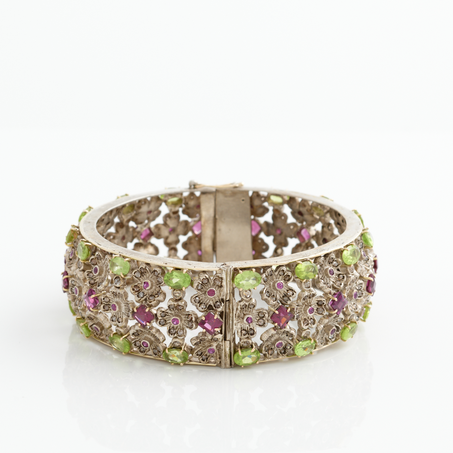 A GEM SET BANGLE IN SILVER, INNER DIAMETER 60MM, A/F